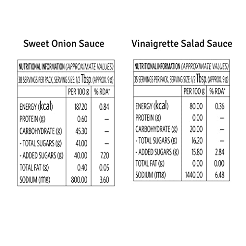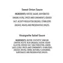The vinaigrette dressing has quite a flavour that adds a punch to the salad, whereas the sweet onion dressing could do better with its flavour. The sweet onion dressing is very sweet and tastes like honey.