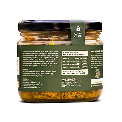 A traditional Maharashtrian pickle calledKhar; made using only Gavran Kairi (native variety locally grown mangoes from Maharashtra) and stone-ground turmeric. Whole Mustard seeds Niger seeds (Karale) and Khada Hing (Asofoetida) are an important part of the recipe. This pickle is handmade in small batches using unrefined in traditional Matkas (earthen pots) using lacto fermentation techniques and does not contain synthetic or natural vinegar.