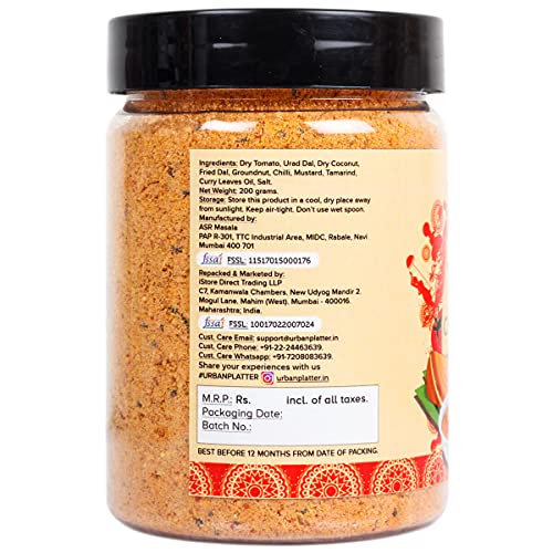 Urban Platter south Indian style instant tomato coconut chutney powder 200g/ 7oz [Nariyal ki chutney just water] create instantly south Indian style tomato coconut chutney with our chutney powder. Most authentic taste and ready instantly. No artificial colours flavours or . No onion & garlic. Excellent side dish for idli dosa appam chapatti and roti varieties. Preparation - take 4Tsps of the chutney powder in a vessel. 50ml of water mix well and enjoy as a tasty side dish.
