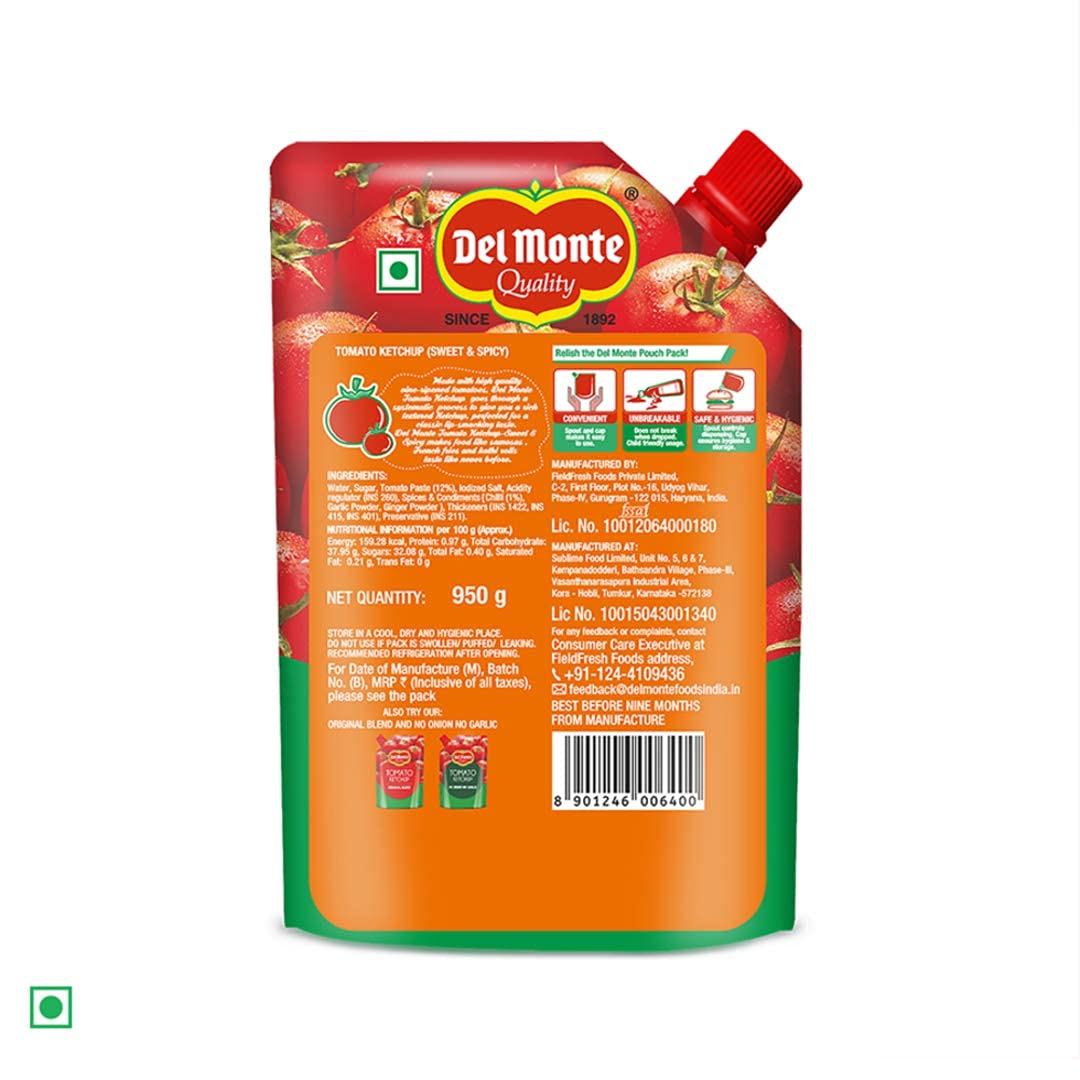 Del Monte Tomato Ketchup Sweet and Spicy Pouch 950 gMade with high quality vine-ripened tomatoes. De monte tomato ketchup goes through a systematic process to give you a rich textured ketchup perefcted for a lip smacking taste.Del Monte Pizza & Pasta Sauce Spout Pack 400gRich flavourful and multi-purpose pizza and pasta sauce to whip up delectable pizzas and pasta right in your kitchen! Now in an easy-to-handle spout pack that offers great convenience and value-for-money.