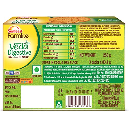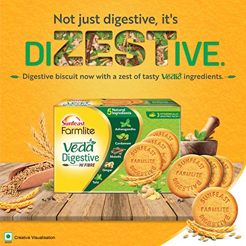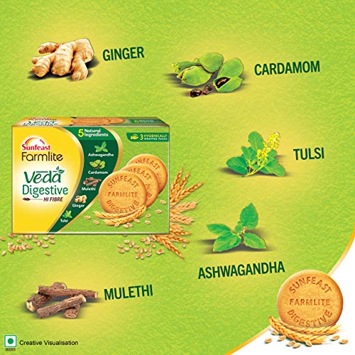 Sunfeast Farmlite Veda digestive biscuit - Not just digestive it's DiZESTive Loaded with choicest ingredients that lend a rich zesty taste Sunfeast Farmlite is the answer for when you're looking for something that is more than just a digestive biscuit With goodness of 5 natural ingredients like Ginger Tulsi Mulethi Cardamom and Ashwagandha and choicest grains this wheat fibre biscuit packs a balanced taste with a lingering aroma that has the perfect golden crunch to it A perfect tea time snack or when you're looking to kill those hunger pangs these biscuits are your 4PM companion for when you want a crunch-filled bite of goodness