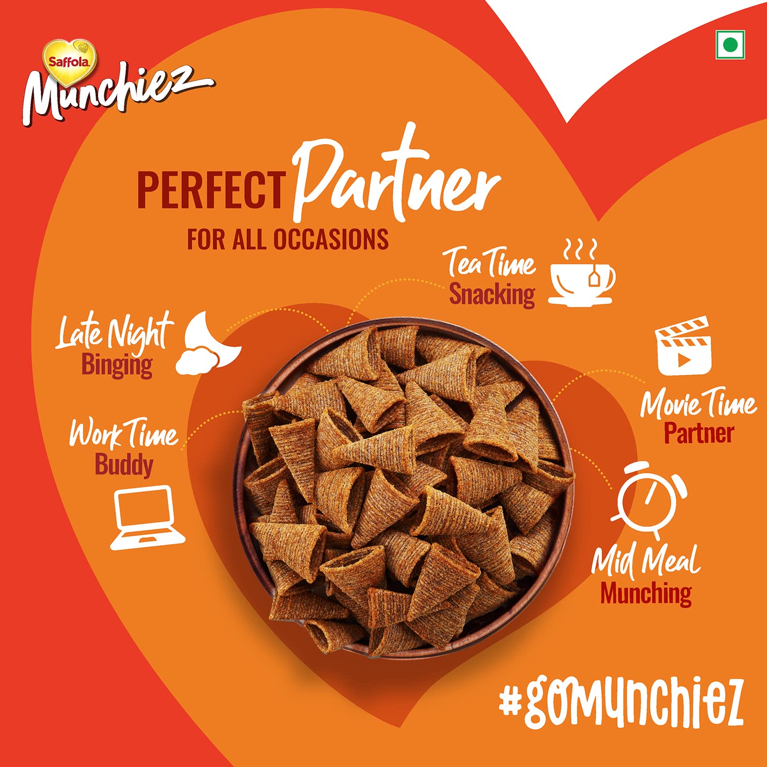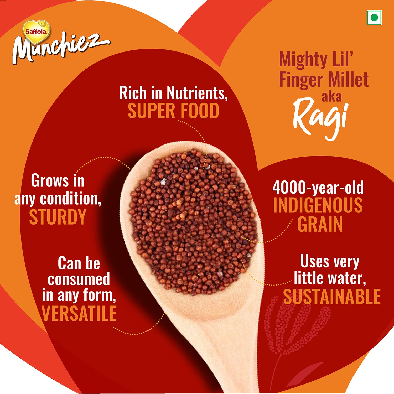 Saffola Munzhiez is a range of tasty and healthy snacks that you love in flavours that you crave. Whether you need a quick hunger fix in between your meals or want something to accompany your late-night binge of your favourite series or want to share snacks during your hang out with friends Saffola Munchiez is the perfect partner for all such occasions. The Ragi Chips range of products have been made with Ragi - the king of all grains. It is a 4000-year-old indigenous grain that is high on nutrition needs minimum fertilisers to grow and uses very little water. It is thus good for the consumer the farmer and mother nature. We retained the benefits of Ragi and converted it into unique cone shaped chips and seasoned them with mouth-watering masala and tomato flavours. Saffola Munchiez Ragi Chips contains 50% less saturated fat as compared to other fried potato chips in the market. It is also high in calcium and a source of fiber. Try out our other product range of Saffola Munchiez Roasted Makhana also and dive into a mouth wateringly delightful snack-time!! Let's go munching with Saffola Munchiez!
