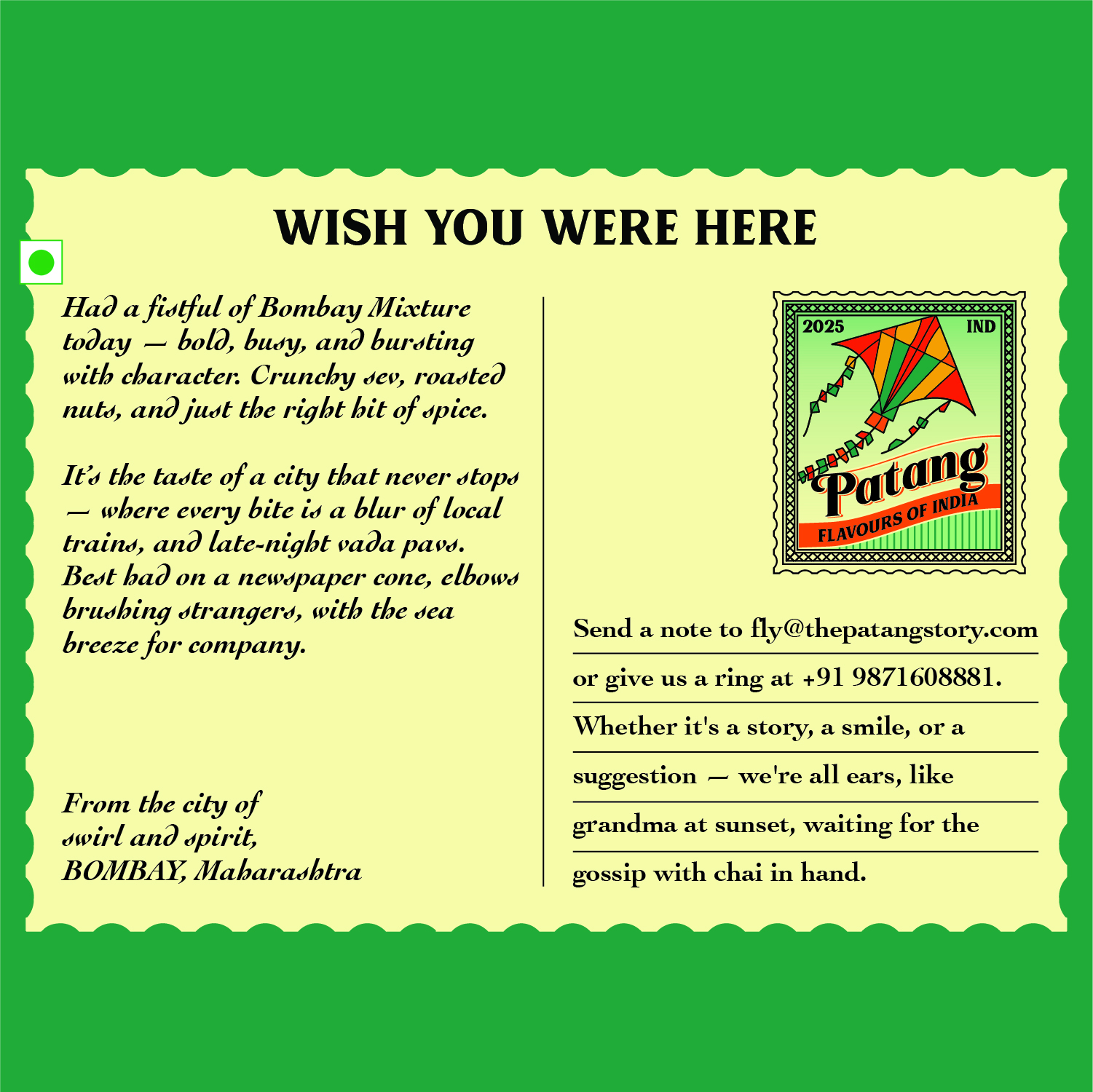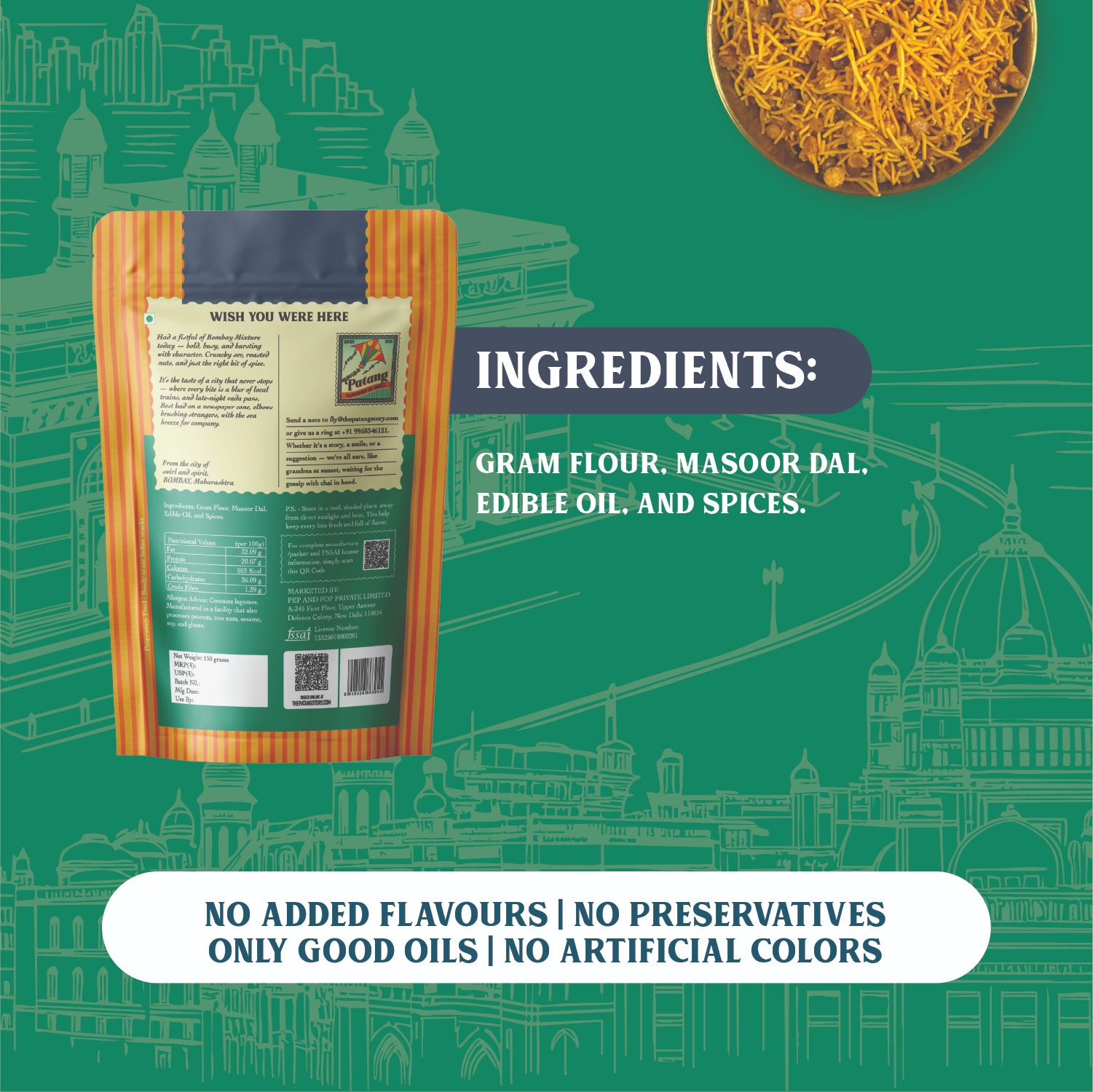 We make it the Patang way with clean ingredients and no bad oils. The flavour is bold but never harsh. Light enough for daily snacking yet satisfying enough to remind you of home. For Indians living anywhere in the world, this brings back the comfort of Irani cafés, local trains, and every chai break that ever mattered.