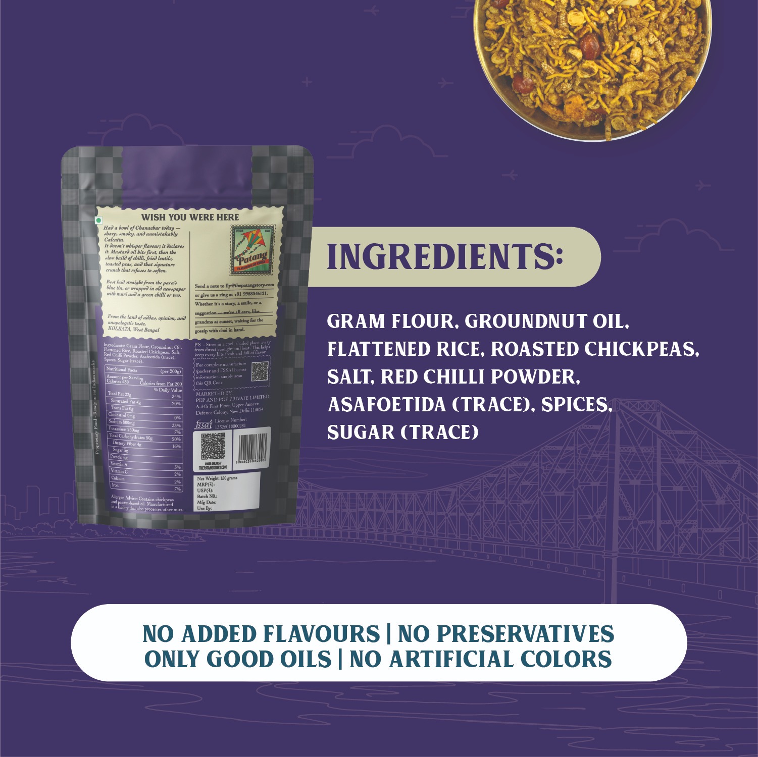 • Iconic Kolkata snack: A tangy and spicy mix of sev, chana, masala peanuts, and fried lentils capturing the vibrant street adda culture.