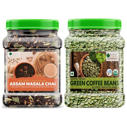 Bliss of Earth Masala CTC Tea (Chai) with Herbs & Spices is a healthy blend of Assam CTC Tea Leaf Assam Black Orthodox Tea and Twenty Herbs and Spices that produce a unique taste to traditional Milk Tea and also reduce the gas and acidity which is common with ordinary CTC tea. Our CTC Tea (Chai) is a Blended Herbal Tea made from finest Tea Leaves produces in Upper Assam region and enriched with Orthodox Black Tea Leaves to produce perfect Taste Aroma and Colour. It is blended by Tea Experts with Twenty Herbs and Spices that add a unique taste and herbal benefits making your everyday tea drinking more healthy. The unroasted seeds of the plant Coffea Arabica Green coffee beans overflow with antioxidants that battle it out with free radicals that speed up skins ageing.It cleanses our liver freeing it from toxins bad cholesterols and unnecessary fats. A healthy liver henceforth enhances our metabolism leading overall better health. Laden with fatty acids and esters including Arahidic Acid Linoleic Acid and Oleic Acid Green Coffee Beans help prevent skin sagging droopiness and wrinkle formation. All of this contributes to a younger radiant and more vibrant skin