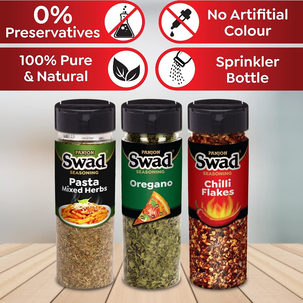 Panjon Swad Oregano, Pasta Mixed Herbs Seasoning & Chilli Flakes, 0% Preservative (3 Bottles) 300G