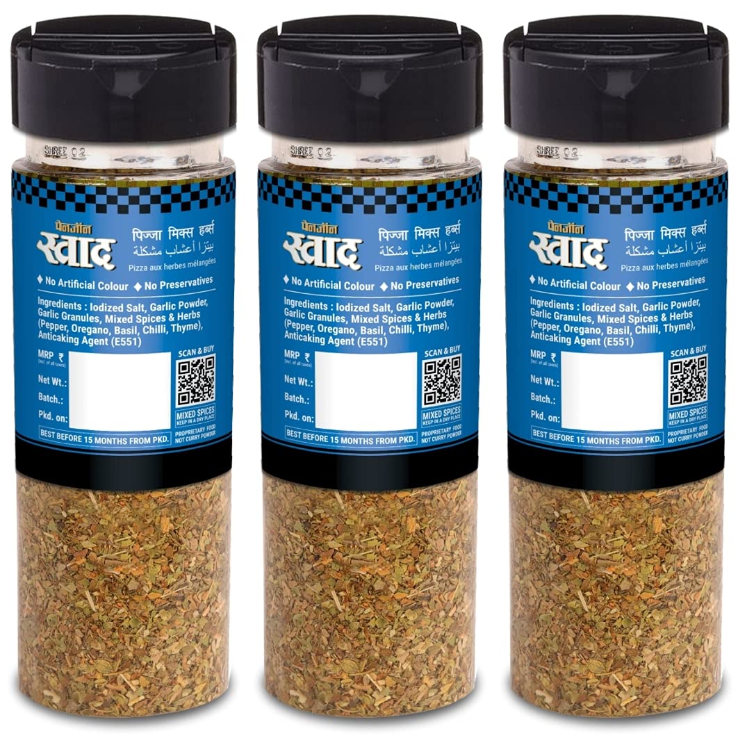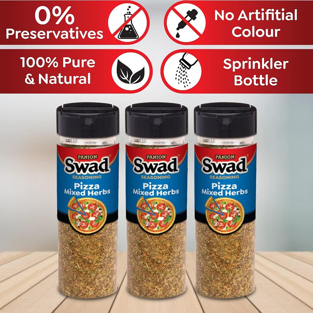 ?100% PURE & NATURAL: No Preservative No Artificial Color. Swad Masala & Seasoning are made of hand picked Spices & herbs Grinded in cool grinding technology to retain its Aroma & Freshness Goodness. Packed in a convenient Pack. Panjon Swad Pizza Mixed He