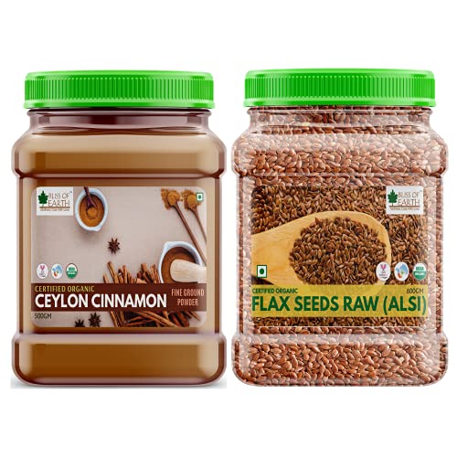 Bliss of Earth Certified Organic Ceylon Cinnamon Powder is a purer and healthier version of cinnamon. Ceylon cinnamon has a sweeter & delicate flavor than the more common Cassia cinnamon.In addition to its positive medicinal benefits ceylon cinnamon is ideal for all culinary usage.Our Ceylon Cinnamon is organically grown harvested and manually processed using traditional methods that have been used for centuries.Ceylon cinnamon known as true cinnamon is the purest form of cinnamon. Most commercial cinnamon is of the Cassia variety which has much less flavor or nutritional benefit since it contains much higher levels of coumarin. Ceylon cinnamon also has a more pleasant fragrance than the harsh pungent Cassia cinnamon. Use our pure cinnamon in your recipes and taste the difference. Bliss of Earth Certified Organic Flax Seeds popularly known as Alsi is one of the popular health food due to its high content of hearth healthy OMEGA-3 fats fiber and other plant compounds. It offers many health benefits such as improved digestion and reduced risk of heart disease.