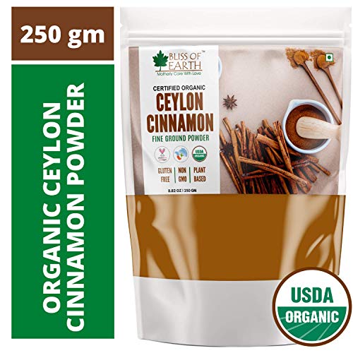 Bliss of Earth Certified Organic Ceylon Cinnamon Powder is a purer and healthier version of cinnamon. Ceylon cinnamon has a sweeter & delicate flavor than the more common Cassia cinnamon.In addition to its positive medicinal benefits ceylon cinnamon is ideal for all culinary usage.Our Ceylon Cinnamon is organically grown harvested and manually processed using traditional methods that have been used for centuries.Ceylon cinnamon known as true cinnamon is the purest form of cinnamon. Most commercial cinnamon is of the Cassia variety which has much less flavor or nutritional benefit since it contains much higher levels of coumarin. Ceylon cinnamon also has a more pleasant fragrance than the harsh pungent Cassia cinnamon. Use our pure cinnamon in your recipes and taste the difference.