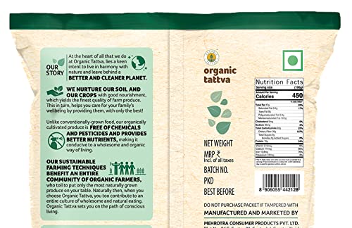 Our Mission: Our brand mission is to help people live a healthier wholesome life by providing them with a variety of 100 percent certified authentic organic foods. We value honesty integrity and continual self-improvement. We are committed to a sustainable environment zero-additive foods and complete customer-satisfaction. Brand philosophy: The brand organic tattva is based on the principles of health ecology fairness and care. At organic tattva the team works with accredited organic farmers who do not use fertilizers pesticides and genetically modified seeds so that their consumers can enjoy the benefits of nature and relish nutritious healthy pure and chemical-free food an important factor contributing to overall wellbeing.