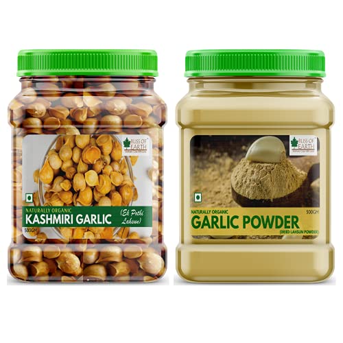 Bliss of Earth Kashmiri Lahsun or kashmiri garlic is a rare single clove varity of allium sativum. It is popolarly knows as snow mountain garlic of ek pothi lahsun in Hindi. Kashmiri garlic is an excellent source of vitamin B1 B6 C as well as copper selenium and phosphorus. It has various health benefits and can be used both raw & cooked. Direction for use: Crush & consume raw daily with water. Use in your cooking recipies. Ingredients: Kashmiri Garlic Bliss of Earth Naturally Organic Garlic Powder is an excellent alternative of fresh garlic as it is made from dehydrated cloves of garlic. It enhances and gives the purest garlic flavor to all your favorite family recipes. Ingredients: Dried Garlic Powder Direction to use: Can be used as a seasoning in stews roasts gravies soups and sauces pizza and pasta etc