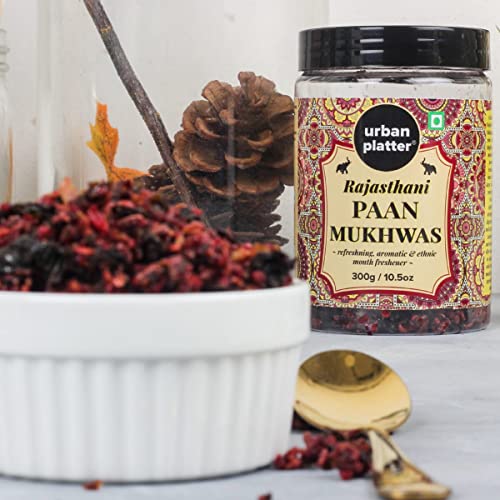 Urban Platter Rajasthan paan mukhwas 300g/ 10.5oz [mouth freshener digestive after-meal snack] a delicious fun mouth freshener/ mukhwas to relish your cravings for tingling taste and mouth-watering aroma. Will remind you of your childhood days. Eat'em up at your past time. Acts as an appetizer. It strengthens the digestive process and also promotes absorption of nutrients. Indian after-meal snack or digestive aid widely used as a mouth freshener especially after meals. Urban Platter - simply good food.