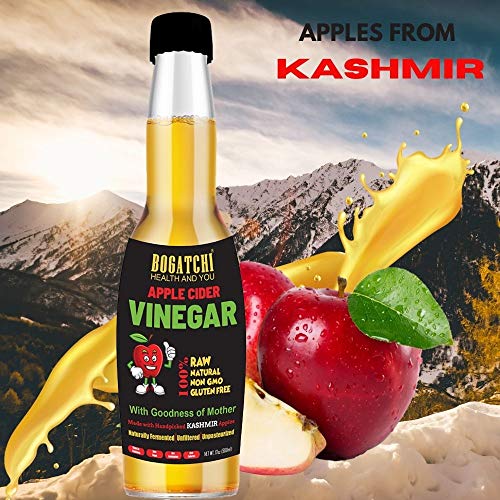 BOGATCHI apple cider vinegar is made of handpicked Kashmir apples. The process is natural fermentation and packaging with no filtering no pasteurization and no dilution. The apples are allowed to age naturally. Made with strand of mother contains natural proteins vitamins and good bacteria. Product benefits: rich in enzymes & potassium support a healthy immune system helps control weight promotes digestion & ph balance helps soothe dry throats helps remove body sludge toxins; personal benefits: helps maintain healthy skin helps promote youthful healthy bodies soothes irritated skin relieves muscle pain from exercise.