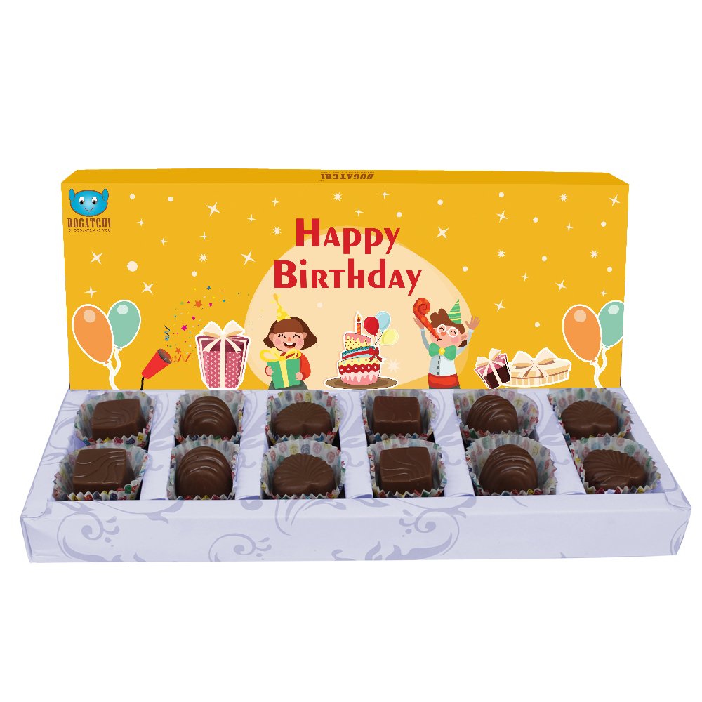 • BOGATCHI BIRTHDAY SPECIAL - HAPPY BIRTHDAY Chocolate Box contains centre filled Rose Patels and Butter Scotch in 18% dark Cocoa