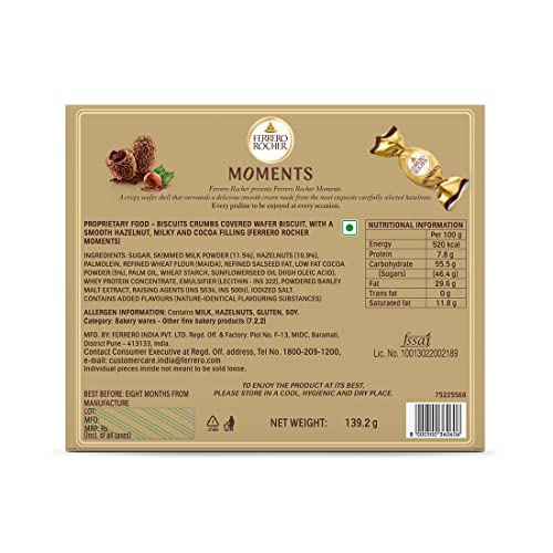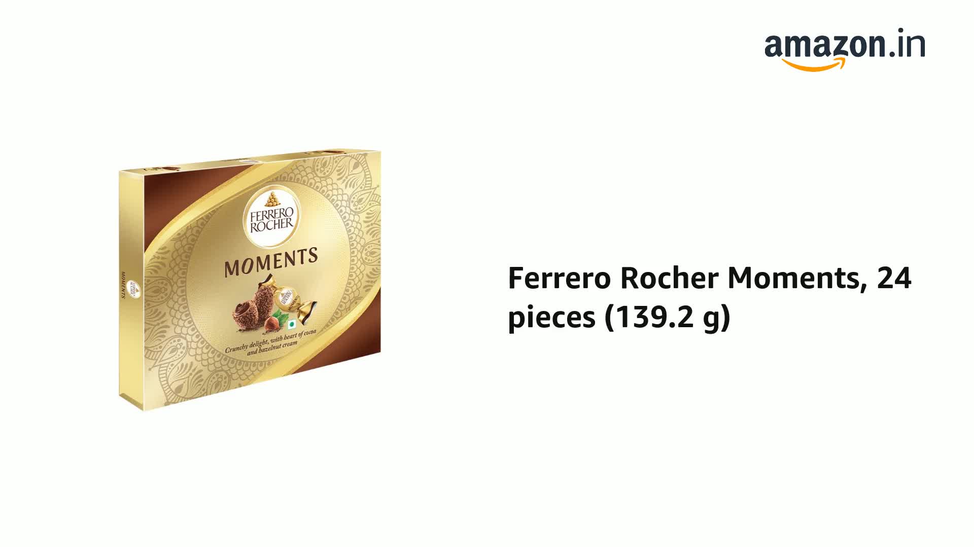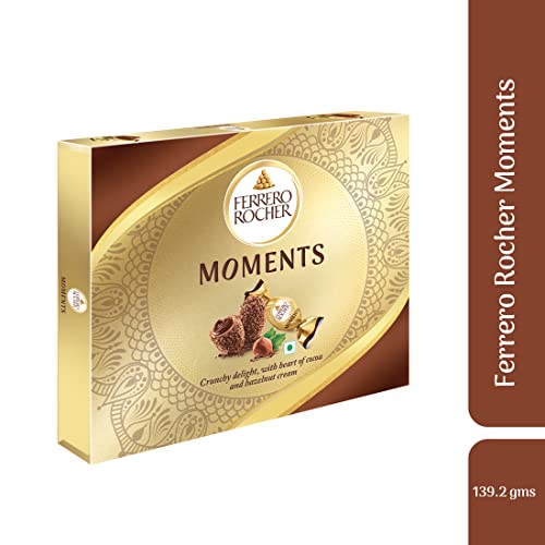 Introducing Ferrero Rocher Moments from the house of Ferrero. Its center is filled with an exquisitely creamy hazelnut filling surrounded by a crispy wafer shell and coated with crunchy cocoa sprinkles. The purest and finest ingredients are chosen so you bite into the best melt-in-mouth experience. Ferrero Rocher Moments are well protected in a hermetic bag that maintains its rich taste even at tropical temperatures. This bag is placed inside a golden easy-to-gift premium pack. Make the moment perfect with Ferrero Rocher Moments.