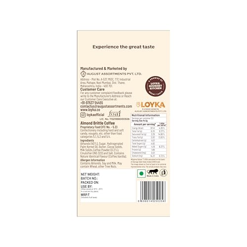 Indulge in the sweet nutty goodness of Loyka's Almond Brittle! Made with the finest ingredients it is a delicious treat that's perfect for any occasion. The combination of roasted almonds dark chocolate & salty caramel creates a taste sensation that's hard to resist. The almonds add a subtle nuttiness that perfectly complements the sweetness of the caramel. Every bite is a heavenly experience with just the right balance of flavors & textures. Loyka's Almond Brittle is an indulgent experience that's perfect for anyone who wants to treat themselves to something special. The rich buttery flavor and satisfying crunch make it an ideal snack for any time of day. Whether you're enjoying a midday snack or a late-night treat our almond brittle is sure to satisfy your cravings. Whether you're looking for a sweet snack to enjoy with a cup of coffee or a decadent dessert to share with friends and family almond brittle is the perfect choice. But our almond brittle isn't just delicious - it's also beautifully packaged. Our elegant packaging is designed to impress with a sleek and sophisticated look that's sure to catch the eye. Whether you're looking for a thoughtful gift for a friend or a luxurious treat for yourself our almond brittle is the perfect choice. It makes for an excellent gift option for your loved ones on special occasions such as birthdays anniversaries and holidays. It's a perfect choice for any occasion and can even be used as a special gift for corporate clients or in weddings. Our almond brittle is made with only the finest ingredients carefully selected to ensure the perfect taste and texture. We use real butter premium California almonds and just the right amount of sugar to create an almond brittle that's rich buttery and perfectly sweet. So if you're looking for a delicious and indulgent snack that's sure to satisfy your sweet tooth look no further than our almond brittle. It's a treat you won't want to miss!