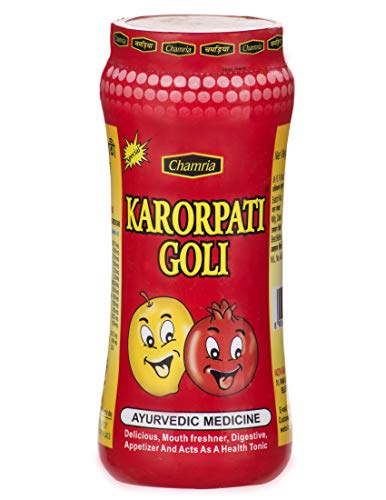 A combo pack of KARORPATI GOLI (anardana goli.) GASLIN & MANGOLA . Karorpati Goli is a royal combination of Anardana (bedana seeds) & Gulkand (prepared from rose petals) along with Rich Indian spices to give it a unique mouth watering taste. Khatta Mitha Anar ka Maza. It is also known for its efficacy in digestion. A renowned "Laajawab" product the ultimate in pachak industry only from the house of CHAMRIA. It is a time tested Favourite of India since 1860. A unique combination of Good Health & Good taste. THE TASTY MANGO BITE !!! CHAMRIA MANGOLA IS INDIA'S BEST AAM PAPAD COATED WITH RICH SPICY MASALA WHICH GIVES IT A TANGY TASTE. NOW ENJOY KACHA MANGO THROUGHOUT THE YEAR. A TRADITIONAL GREAT AFTER FOOD APPETIZER. SAY NO TO GAS ACIDITY & STOMACH TROUBLES. CHAMRIA GASLIN IS A AGE OLD REMEDY FOR GAS WIND INDIGESTION & CONSTIPATION. IT IS RARE COMBINATION OF RICH INDIAN HERBS PROCESSED SCIENTIFICALLY. A REAL TREAT FROM AYURVEDA AND CHAMRIA. " GAS KA ANT.......TURANT"