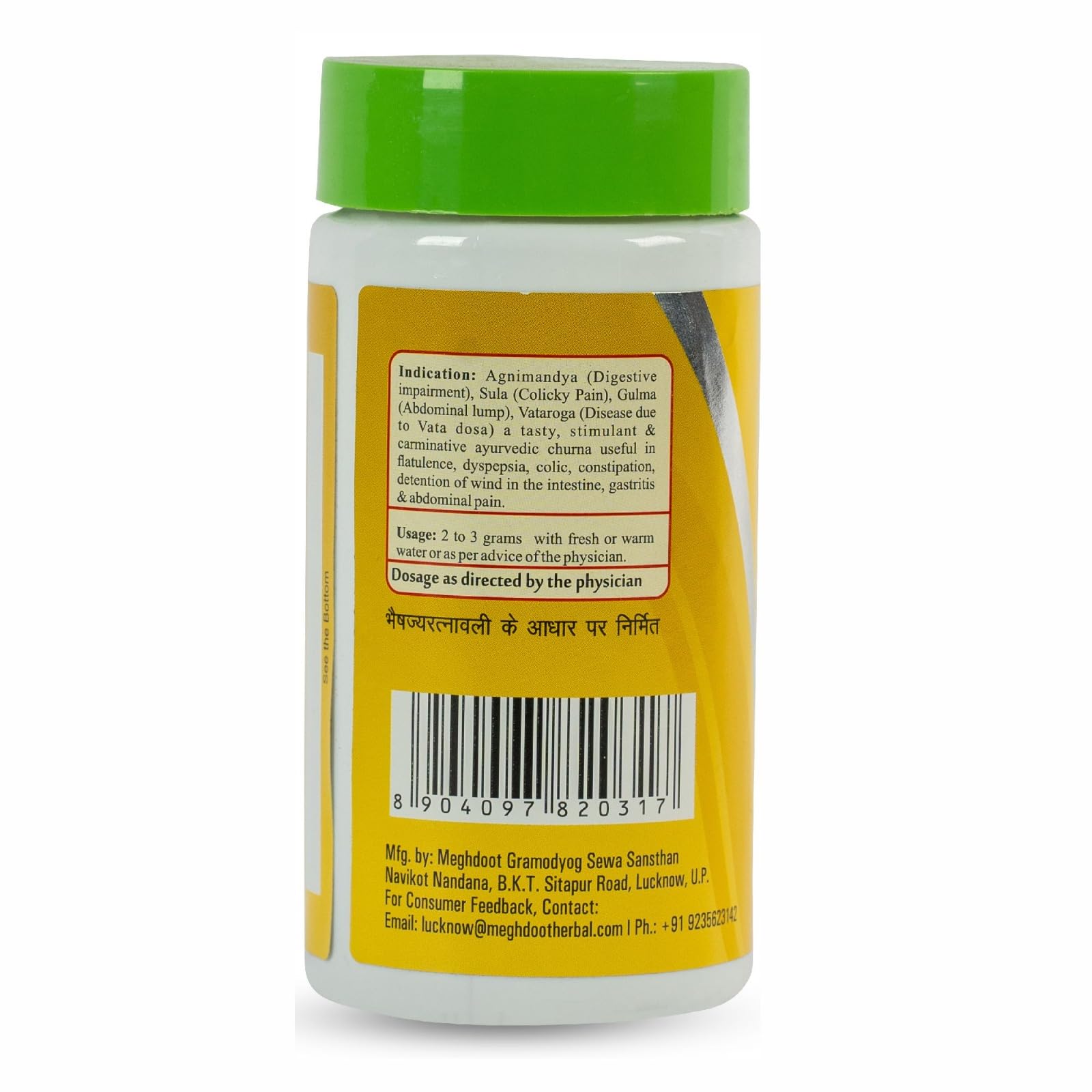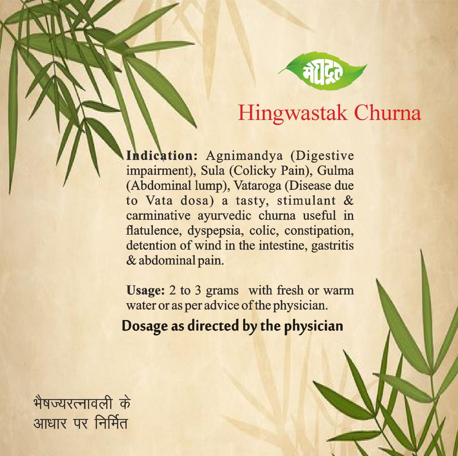 MEGHDOOT Ayurvedic Hingwastak Powder is an effective and natural remedy that combines the power of traditional Ayurvedic ingredients to promote digestive health and provide relief from stomach discomfort. Made with pure Hing (Asafoetida) and a blend of other natural herbs this powder supports healthy digestion helps reduce gas and bloating and relieves symptoms of indigestion. See the Bottom Indication: Agnimandya (Digestive impairment) Sula (Colicky Pain) Gulma (Abdominal lump) Vataroga (Disease due to Vata dosa) a tasty stimulant & carminative ayurvedic churna useful in flatulence dyspepsia colic constipation detention of wind in the intestine gastritis & abdominal pain. Usage: 2 to 3 grams with fresh or warm water or as per advice of the physician. Dosage as directed by the physician.