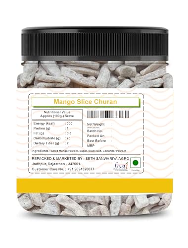 Indulge in the perfect blend of sweet and tangy flavours with Seasonal Kart's Mango Slice Churan. This traditional Indian digestive candy combines the delightful taste of dried mango powder with a carefully balanced mix of black salt sugar and coriander powder. Each piece delivers a burst of authentic mango flavour that's both mouth-watering and satisfying. With 70g of carbohydrates and just 300 kcal per 100g serving it's a guilt-free treat that doubles as a post-meal digestive aid. The convenient jar packaging keeps the churan fresh and easily accessible. Perfect for those who enjoy traditional Indian sweets with a tangy twist this churan offers the authentic taste of traditional mukhwas in a modern presentation. The pure vegetarian product is produced in Jodhpur Rajasthan maintaining the authentic taste that's been cherished for generations.