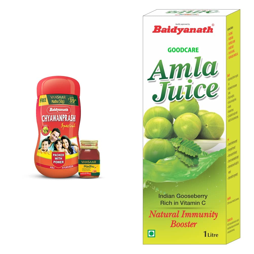 Baidyanath Chyawanprash Special - All Round Immunity and Protection - 1kgExtra energy active mind and increased immunity are the three major benefits of Baidyanath Chyawanprash Special. Years of establishment and potentiality of the brandâs promise has already made us stand out from the crowd. However when it comes to Chyawanprash. The day-to-day illness which is a common trouble in today's world Baidyanath Chyawanprash Special can help bolster your bodyâs immunity to fight them.Baidyanath Amla Juice - Rich in Vitamin C and Natural Immunity Booster - 1LBaidyanath Amla Juice has been extracted from Indian Gooseberry or Amla to provide multiple health benefits for an active body and mind. It is a rich source of Vitamin C Vitamin A Iron Phosphorus Folic acid Carbohydrate and Calcium. It helps boost immunity and is effective against common infections such as cough & cold. Baidyanath Amla juice helps you achieve your weight loss goals if you maintain a strong healthy diet.