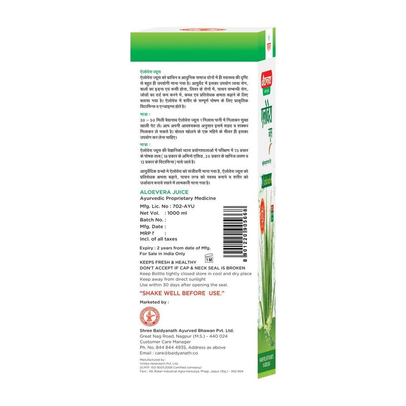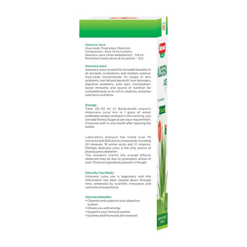ALOE VERA JUICE : Baidyanath Aloe Vera Juice with pulp condenses the magical benefits of this herb into a healthy herbal and wholesome drink. It boosts immunity builds a healthy digestive system and gives relief from constipation. Reduces fat and tones yo