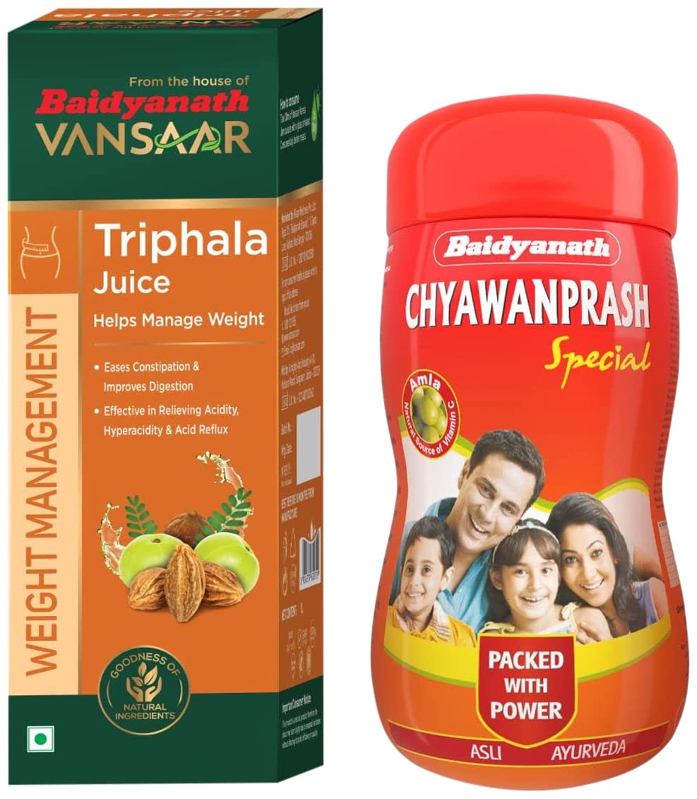 Baidyanath Chyawanprash Special - All Round Immunity and Protection - 1kgExtra energy active mind and increased immunity are the three major benefits of Baidyanath Chyawanprash Special. Years of establishment and potentiality of the brandâs promise has already made us stand out from the crowd. However when it comes to Chyawanprash. The day-to-day illness which is a common trouble in today's world Baidyanath Chyawanprash Special can help bolster your bodyâs immunity to fight them.Baidyanath Triphala Juice - Ayurvedic Herbal Laxative - 1LBaidyanath Triphala Juice is a powerful combination of Amla Haritaki and Bahera. Amla is rich in Vitamin C and helps strengthen the digestive system. Bahera is an ancient plant which is known to detoxify the body and helps strengthen the immune system. Haritaki is known as the âKing of Medicineâ and is regarded highly in Ayurvedic medicines. It can be used as a laxative and is beneficial against constipation. Triphala keeps Common digestive troubles like IBS hyperacidity etc. under check and helps maintain a healthy system.