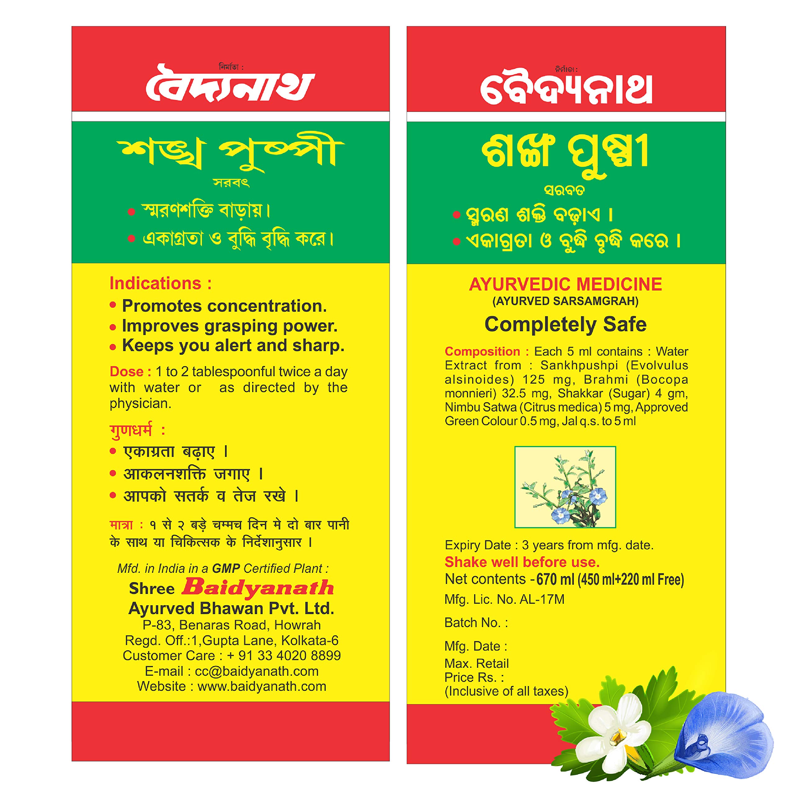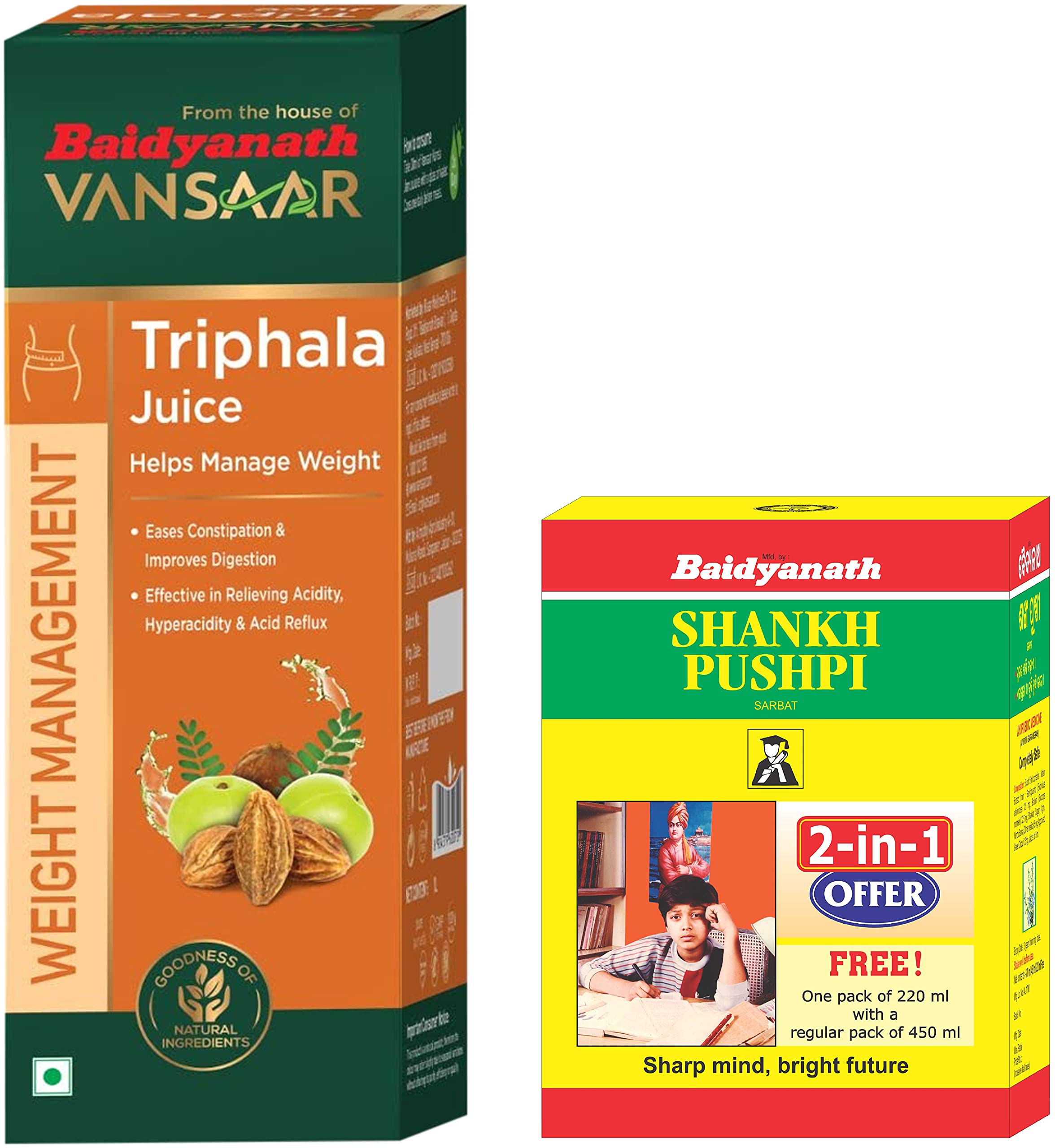 Baidyanath Shankhapushpi Sharbat - 450 ml with Free Sharbat - 220 mlBaidyanath Shankhpushpi Sharbat is an all-natural herbal preparation tonic for kids and adults. Shankhpushpi Sharbat contains Shankhpushpi and Brahmi both are known for their memory boosting powers. It is an active tonic for those suffering from poor memory insomnia and fatigue. It's an ayurvedic concoction that helps make your mind alert and active through the day. Shankhpushpi and Brahmi are known to help combat nervousness and anxieties. Regular consumption of the tonic for children can help improve their concentration and retention of information.Baidyanath Vansaar Triphala Juice | Helps Weight Control | Constipation Relief | 100% Herbal Juice made with Organic Ingredients - Amla Haritaki Bahera - 1LBaidyanath Triphala Juice is a powerful combination of Amla Haritaki and Bahera. Amla is rich in Vitamin C.