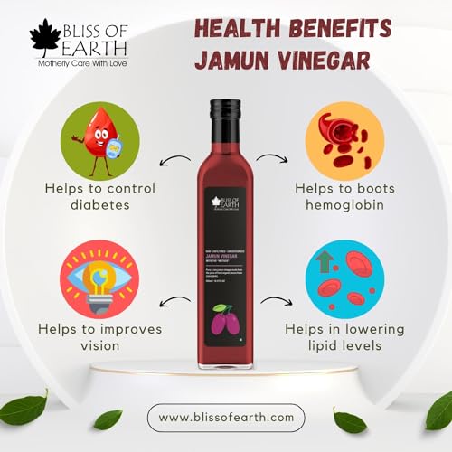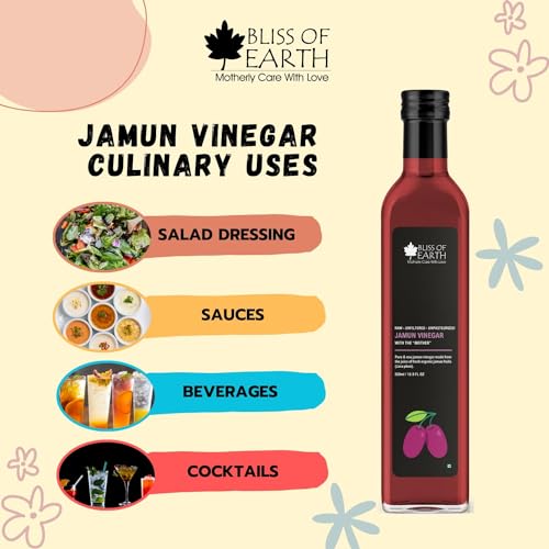 Bliss of Earth Jamun Vinegar is made from the fresh juice of organic Jamun fruit also know as red plum containing the "mother" of vinegar in the form of floating strands. It is raw unfiltered and unpasteurized to keep the enzymes and nutrients intact. Bliss of Earth Jamun Vinegar can be enjoyed as a nourishing culinary tonic and household must have for its unique alkalizing properties.Ingredients: Red Plum Fruit juice fermented to 4% acidity.DIRECTION FOR USE: Mix 2-3 tbs (10-15ml) of Bliss of Earth Jamun Vinegar in a glass of luke warm water and consume daily on empty stomach. You can also add Jamun vinegar to your meal as a salad dressing.CONTAINS NO ARTIFICIAL FLAVOR COLOR OR PRESERVATIVES.It contains strands of "MOTHER" of vinegar a mark or pure vinegar.STORAGE INFO: Refrigerate and consume within 2 months after opening. Store in a cool and dry place away from direct sunlight.