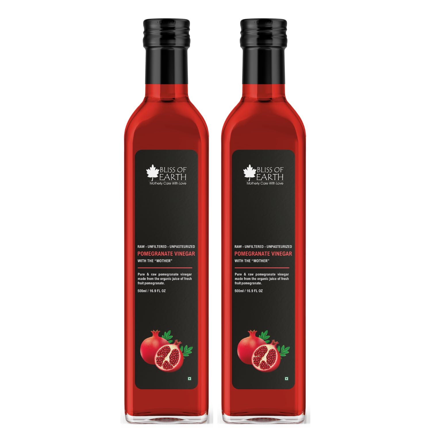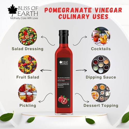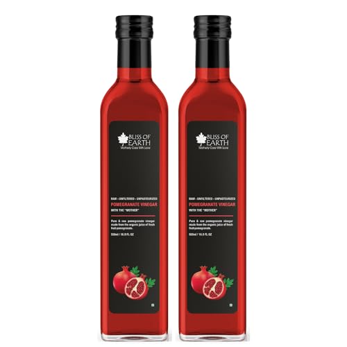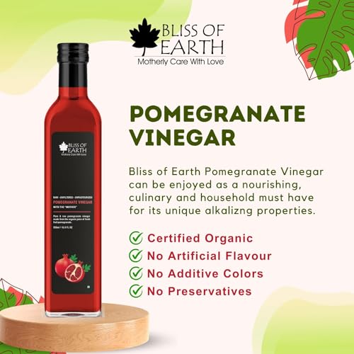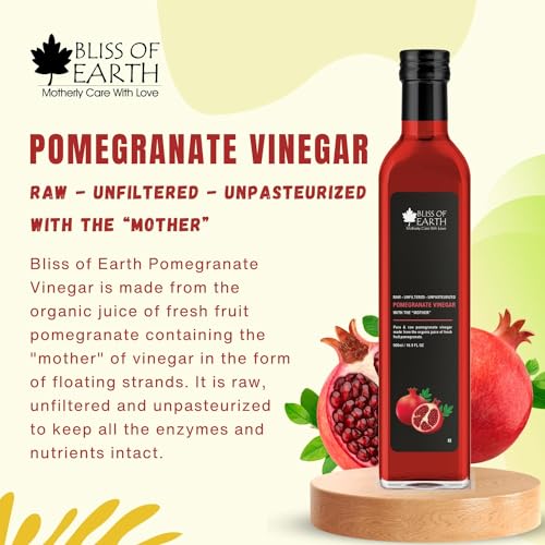 Bliss of Earth Pomegranate Vinegar is made from the fresh juice of organic pomegranates containing the "mother" of vinegar in the form of floating strands. It is raw unfiltered and unpasteurized to keep the enzymes and nutrients intact. Bliss of Earth Pomegranate Vinegar can be enjoyed as a nourishing culinary tonic and household must have for its unique alkalizing properties.Ingredients: Pomegranate Fruit juice fermented to 4% acidity.DIRECTION FOR USE: Mix 2-3 tbs (10-15ml) of Bliss of Earth Pomegranate Vinegar in a glass of luke warm water and consume daily on empty stomach. You can also add pomegranate vinegar to your meal as a salad dressing.CONTAINS NO ARTIFICIAL FLAVOR COLOR OR PRESERVATIVES.It contains strands of "MOTHER" of vinegar a mark or pure vinegar.STORAGE INFO: Refrigerate and consume within 2 months after opening. Store in a cool and dry place away from direct sunlight.