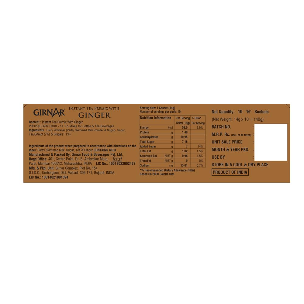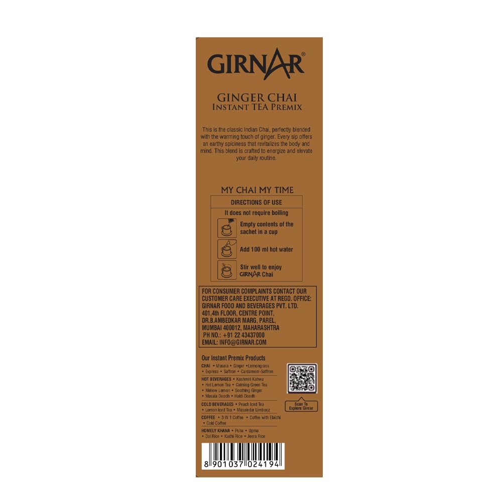 The health benefits of Ginger are known to all. Fuse it with a hot cup of Desi chai and you have the best elixir of all! With Girnar's Ginger Chai Premix you can now savour a cup of Ghar-jaisi Ginger Chai with no hassle at all. Tastefully blended to instantly make a cup of robust chai with a touch of earthy Ginger whose subtle spiciness lingers on the palate. Strong Desi Chai with the all-curing effects of Ginger this brew leaves your body and mind refreshed within minutes.