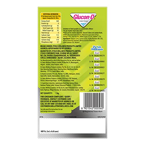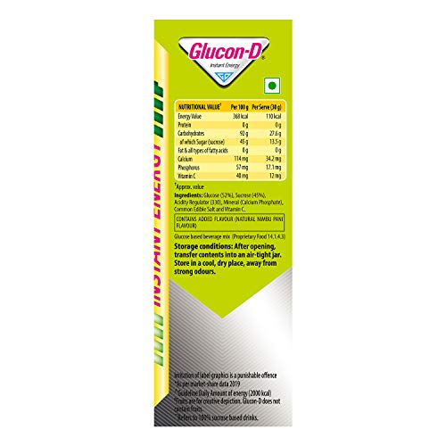 Summers can be daunting and especially when there's an enormous scorching sun always ready to drain out your energy and stop you from being the best of you. But thank god there is Glucon-D! Glucon-D contains glucose that helps replenish body glucose and fills you with the energy required to stay active. It is easily absorbed by the body thus giving out an instant energy boost and refreshment. Enriched with Vitamin-C and Minerals including Calcium and Phosphorus this glucose drink helps you charge up to fight tiredness and promotes mental alertness.What's better? Added Nimbu pani flavour makes it loved by children as well as adults. Add Glucon-D to a glass of water every day to provide growing active children the energy that keeps them going and adults refreshment after a long day. Note: Fruits are for creative depiction. Glucon-D does not contain fruits.
