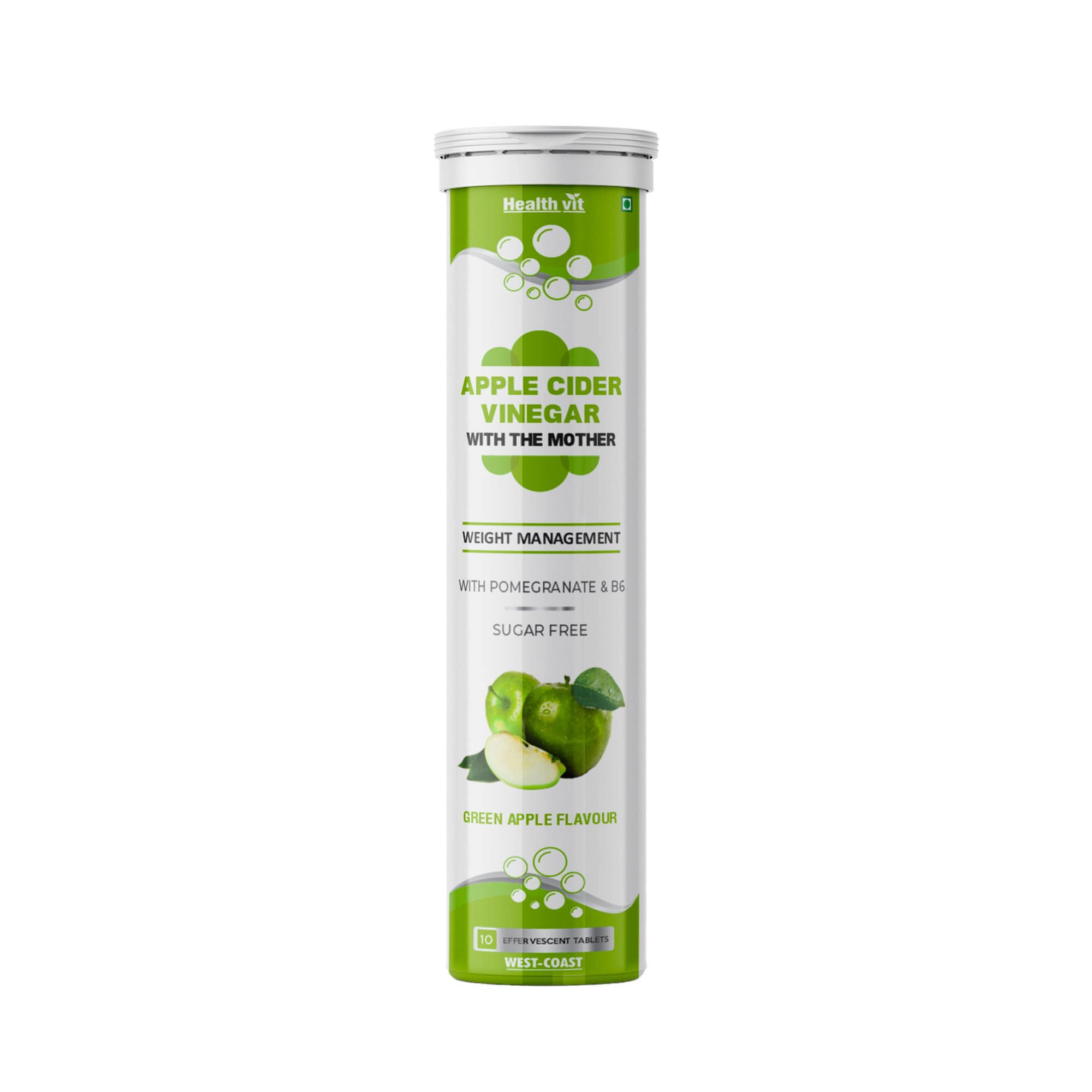 Healthvit Apple Cider Vinegar for Weight Loss and Immunity with Pomegranate & B6 - 10 Effervescent Tablets (Green Apple Flavor) with Natural Pure & Rich in Natural Components. Healthvit ACV Effervescent Tablets will easily be absorbed into the blood stream. A perfect Absorption for a Perfect result. It can Carried anywhere and everywhere (airplanes camping workplace) & use them with normal water. Health Drink ready at your Finger Tips. Traditionally a natural home remedy apple cider vinegar has become a popular ingredient in successful health plans. Ingredients: Apple Cider Vinegar 500mg Pomegranate Extract and Vitamin B6 Suggested Use: 1. Drop a tablet in 200ml of Water. 2. Wait till the effervescent tablet dissolves completely stirring not required. 3. Enjoy the Health Drink. 4. Replace cap tightly after every use to avoid tablet degradation.