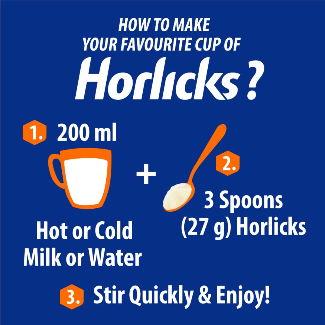 Horlicks is India's #1 Nutrition Drink that helps kids be Taller Stronger Sharper. It contains 27 vital nutrients like Folic Acid Vitamin D Protein Calcium and Iron that help in mental development and physical strength. It also has Zinc and Vitamin E that build immunity. Horlicks is also available in Chocolate delight flavour. For over 150 years Horlicks has stayed true to its original purpose of providing high-quality wholesome nutrition. Made with the goodness of milk wheat and barley and fortified with 27 vital nutrients. Regular intake of Horlicks with daily diet helps in children’s growth and development like better bones more muscles and improved concentration scores. Horlicks is clinically proven to make kids Taller Stronger Sharper! • Calcium Phosphorus Magnesium & Vitamin D supporting height gain – Taller. • Protein & Potassium supporting healthy bones and muscles – Stronger. • Vitamin B9 B12 Iron Iodine & Zinc supporting attention & concentration – Sharper. • Vitamin A E C Copper & Selenium to support immunity. For your favourite cup of Horlicks just take 200 ml of hot or cold milk or water add 3 spoons (27 g) of Horlicks stir briskly and enjoy! This iconic drink has been a household name for over a century synonymous with nourishment and wellness. Today Horlicks stands as a beacon of nutritional goodness cherished by generations across the globe.