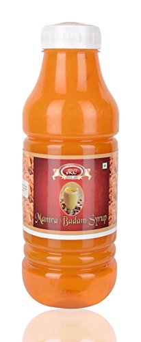 This is a bottle of Mamra Badam syrup which weighs around 1Liter. It is made of mamra badam sugar water kesar elaichi & citric acid. It has a shelf life of 12 months. It is recommended to be stored in a cool and dry place. Rich Flavor of Mamra Almonds giving the perfect taste and blend to a royal Indian drink