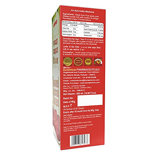 Lama Pharmaceuticals Apple Cider Vinegar with Mother of Vinegar, Detoxifies Body, Improved Digestion, No Artificial Flavours, Herbals Dark Color, Small, 500 ml