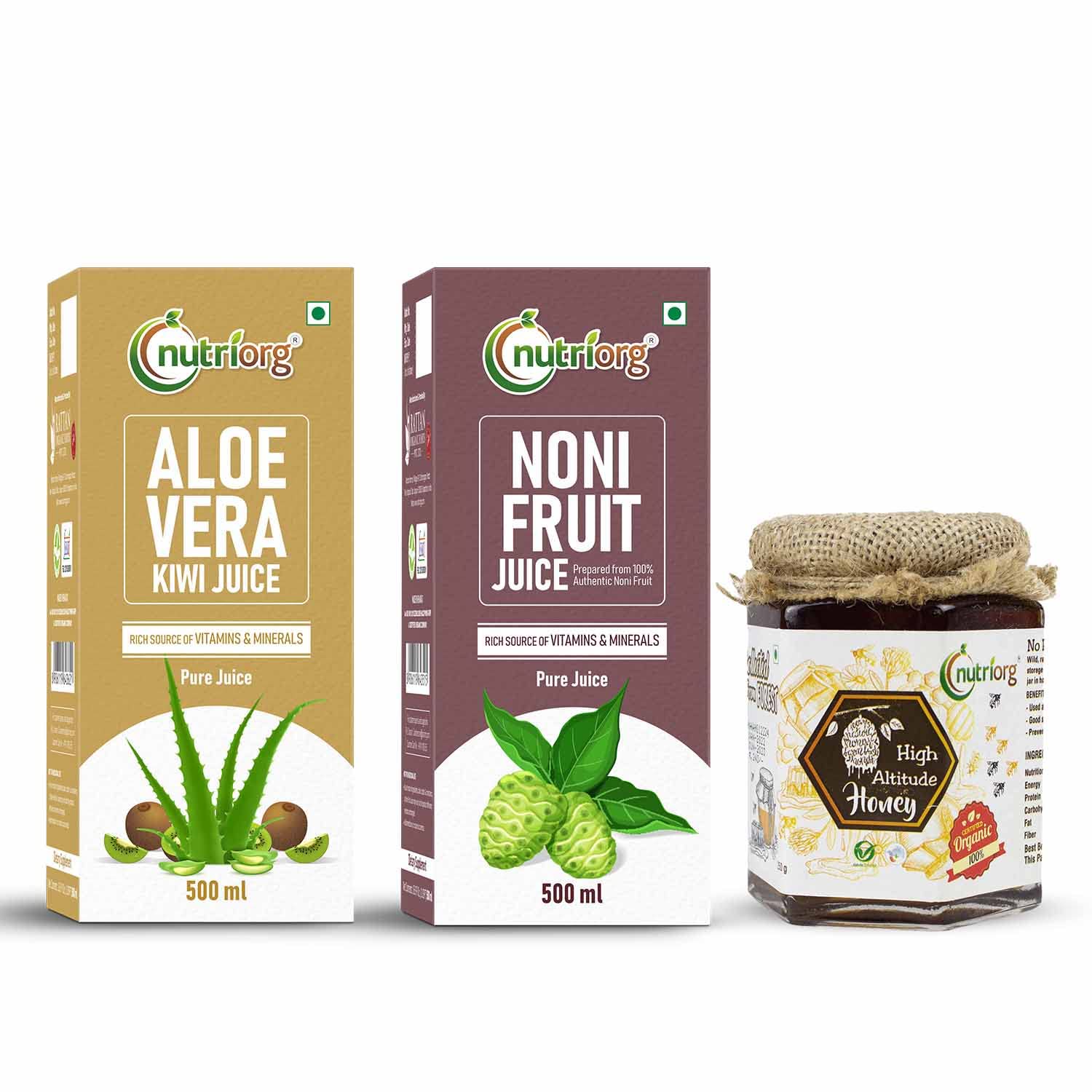 Nutriorg Aloe Vera Kiwi & Noni Juices With Certified Organic High Altitude Honey 250g (Combo Of 3) | Organically Grown | Immunity Booster | Natural Sweetener