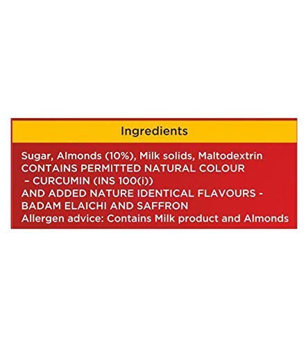 Sugar Almonds (10%) Milk Solids Added Nature Identical Flavors - Badam Elaichi & Saffron Permitted Natural Colors