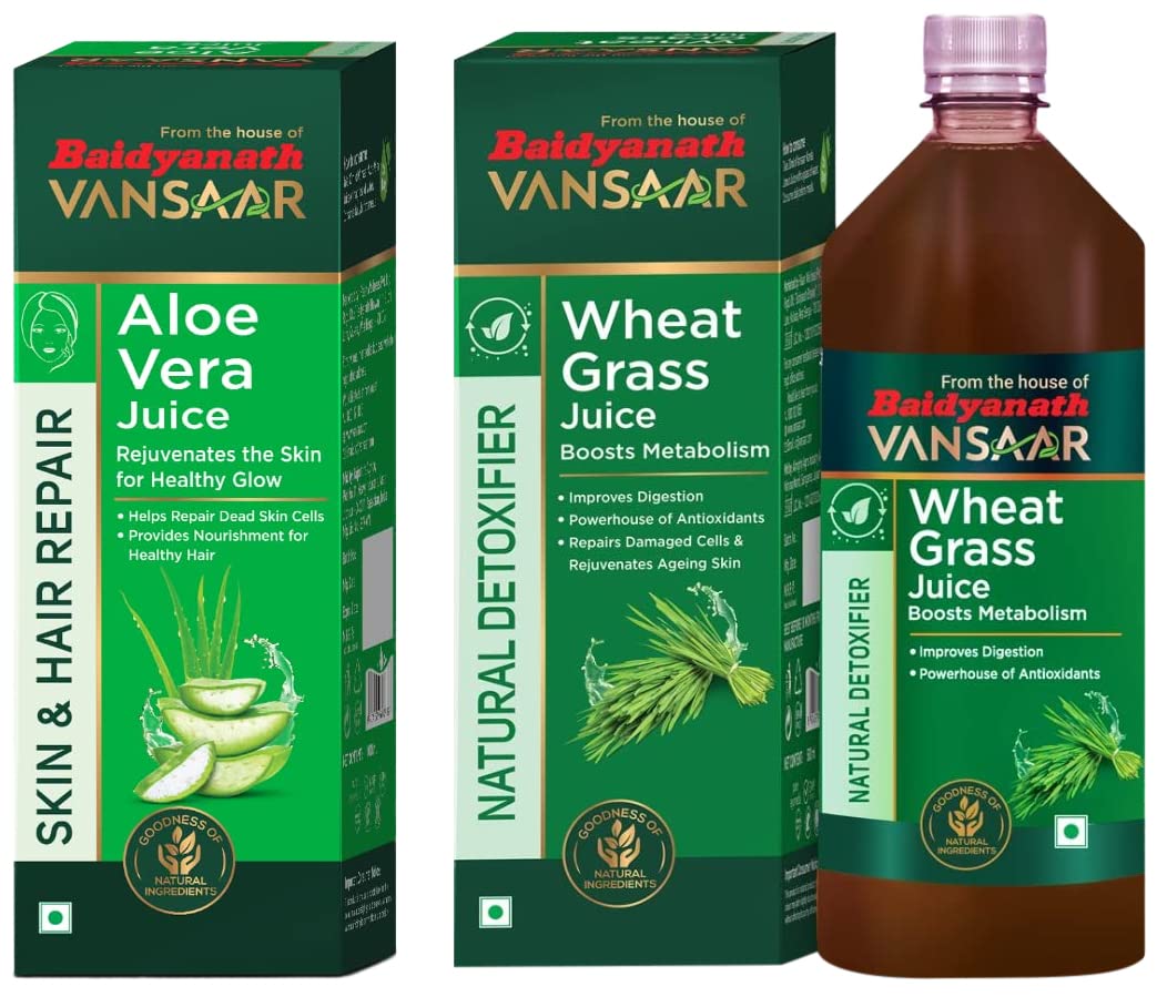 Vansaar Combo of Ayurvedic Juices ensure maximum health benefits. All Juices in this combo pack such as Aloe Vera juice and Wheatgrass juice are 100% natural organic Made of Pure Cold Pressed ingredients. Vansaar Aloe Vera Juice and Vansaar Wheatgrass juice are 100 % pure and made of freshly harvested natural Aloe Vera and fresh Wheatgrass. Both these healthy juices are free from any added flavours or additives and have maximum nutritional properties.