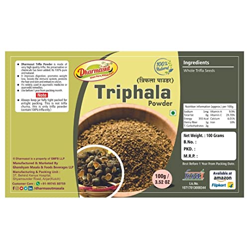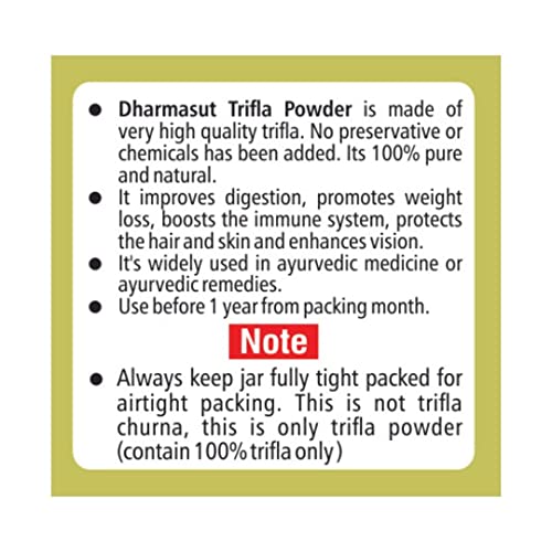 Dharmasut Triphala Powder is made of very high quality triphala. No preservatives or chemicals have been added. It's 100% natural and pure. Triphala powder is effective in gas and acidity relief improves digestion promotes weight loss boosts the immune system protects the hair and skin and enhances vision. It's widely used in ayurvedic medicine or ayurvedic remedies.