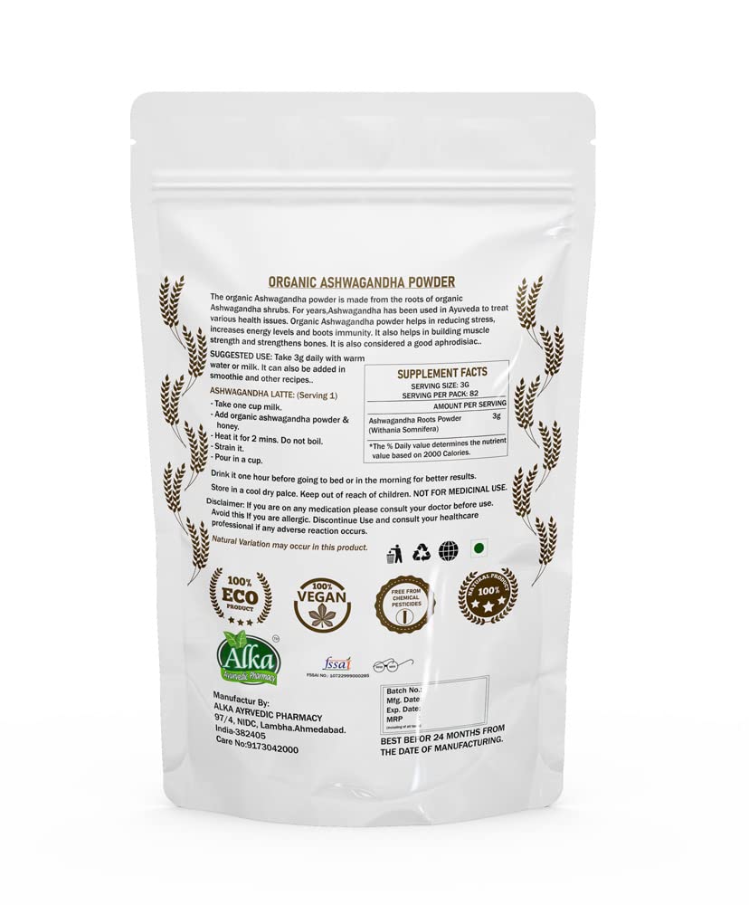 100% Organic Free from pesticides chemicals or additives Processed in gluten free environment and processing unit Processed in Dry Environments-Ashwagandha grows ideally in dry and gluten free environments. These dried conditions are used for preservation of Ashwagandha roots. WORKS AS A SKIN TONER-A toner is an essential part of any womanâs skincare regimen and Ashwagandha is a wonderful skin toner which helps in cleansing the skin and shrinking the pores.