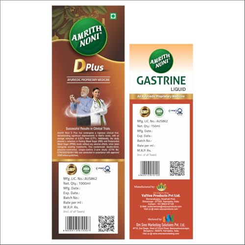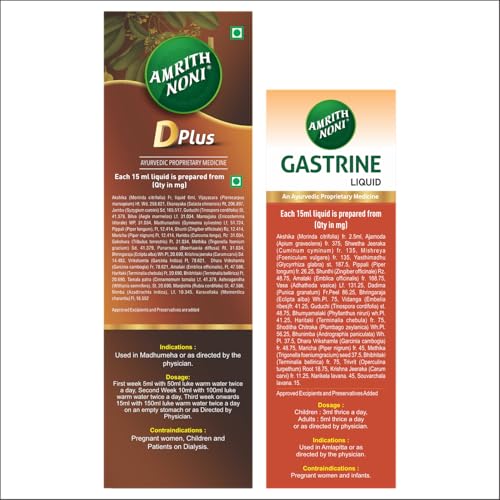 Amrith Noni D plus How to consume: 1st week - 5ml with 50ml warm water 2nd week - 10ml with 100ml warm water 3rd week - 15ml with 150ml warm water Twice a day. Amrith Noni Gastrine Sugar Free juice: How to consume: 1st week - 5ml with 50ml warm water 2nd