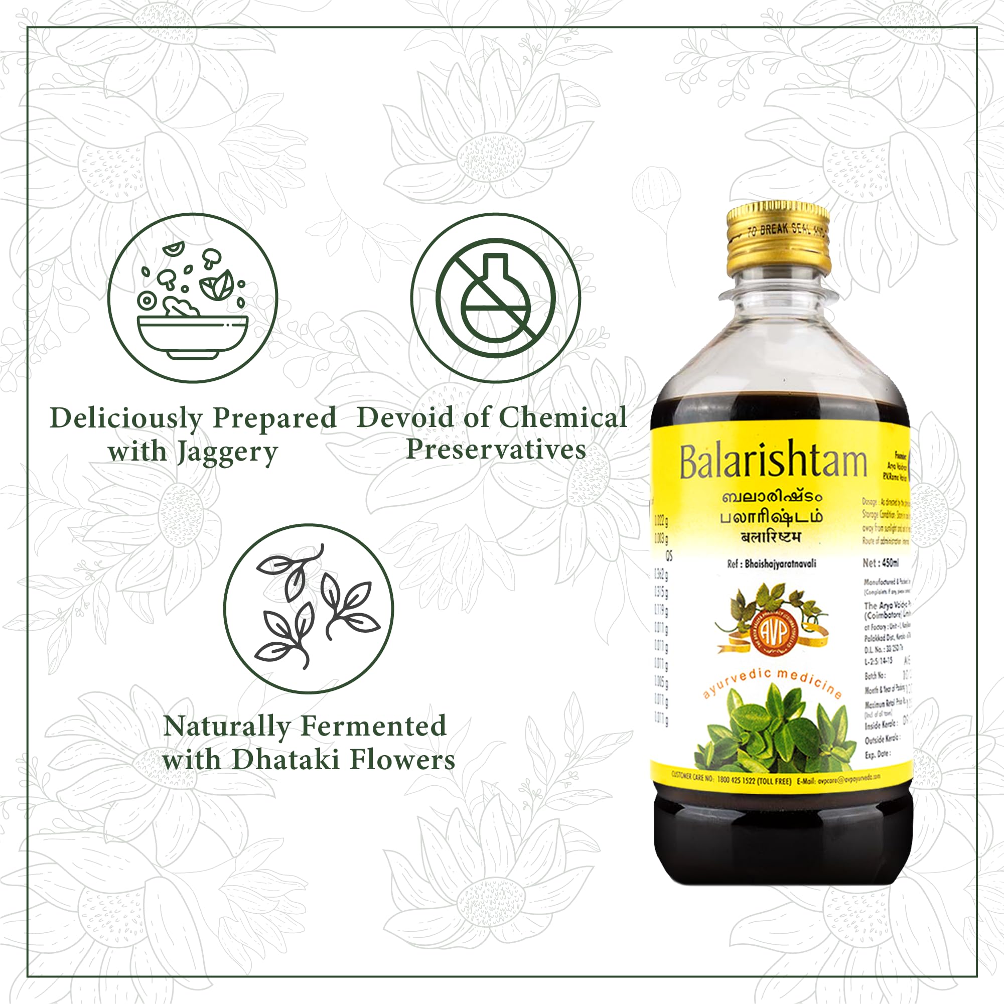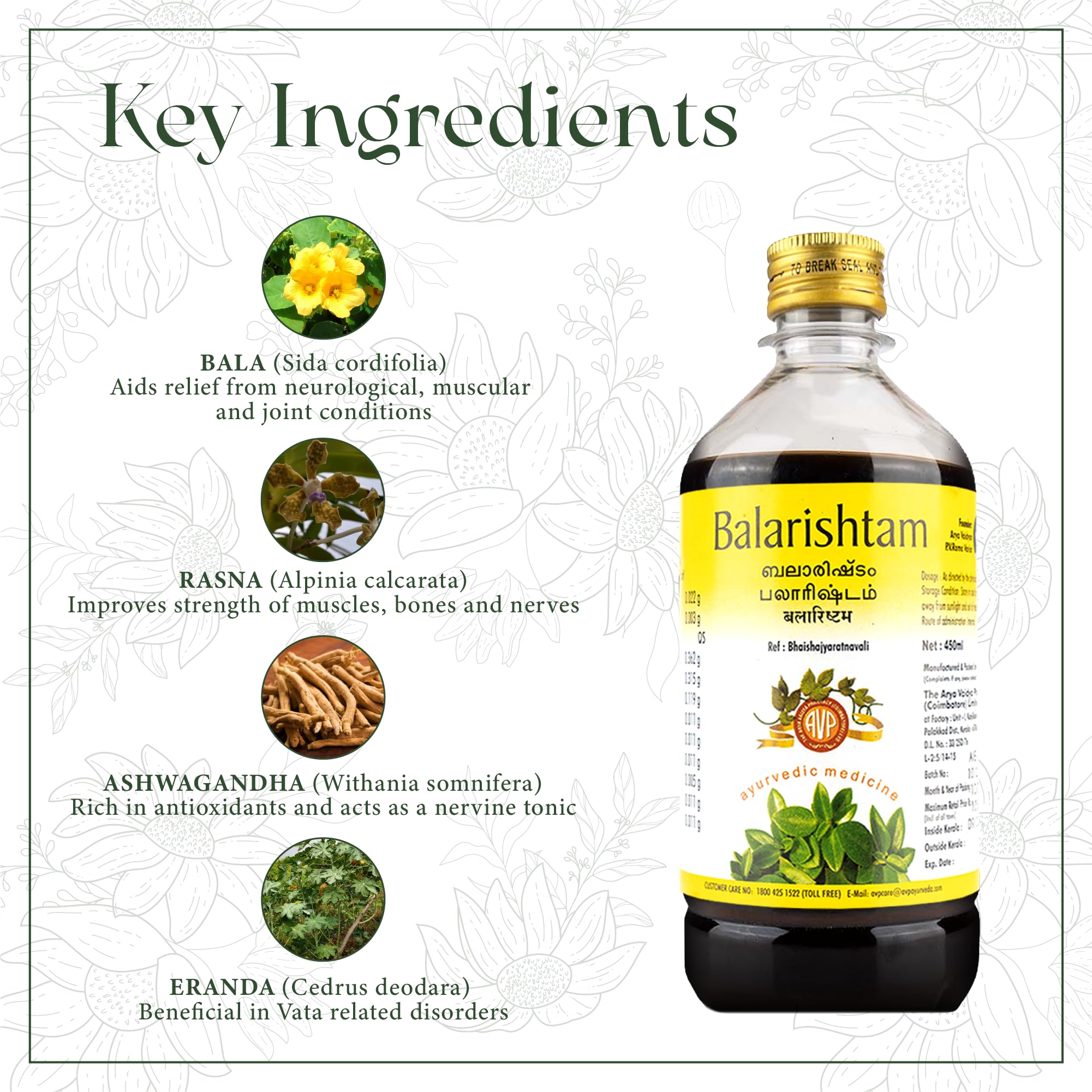 An exquisite blend of herbs for revitalising and strengthening the body! AVP Balarishtam is delicately curated with ingredients to improve nervous muscular and digestive strength while nourishing the body.