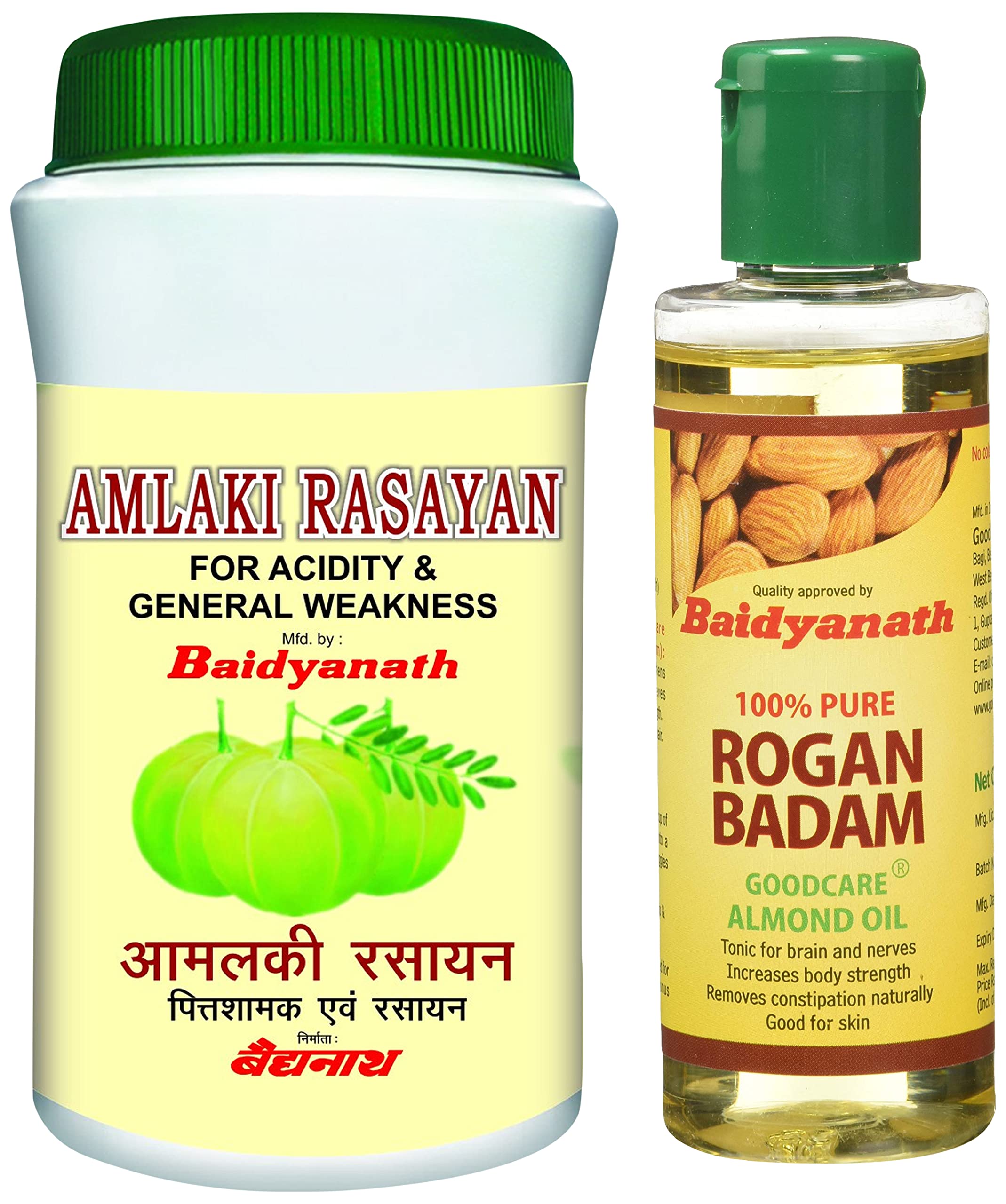 Baidyanath Amlaki Rasayan - 120 g (Pack of 2)Ingredients are amla churna (emblica officinalis) madhu ghee pipal churna (piper longum) khand (sugar) amla ras.Baidyanath Rogan Badam (Almond) Oil | 100% Pure Cold Pressed & Sweet Almond Oil | For Glowing Skin & Hair Growth - 100 MLIngredients : Almond Oil(Prunus amygdalus)