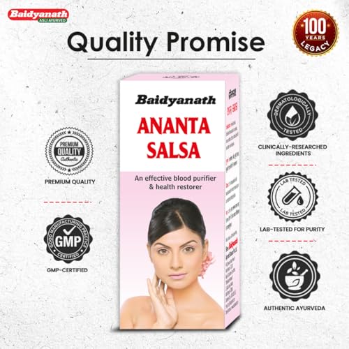 Baidyanath Ananta Salsa is an Ayurvedic formulation of Anantamool and other ayurvedic ingredients which help combat skincare problems by cleansing internally. This formulation helps fight acne itchiness and hairfall troubles. Mix 2 to 4 teaspoonfuls of this syrup with equal quantities of water and consume is twice a day or as directed by an Ayurvedic practitioner.