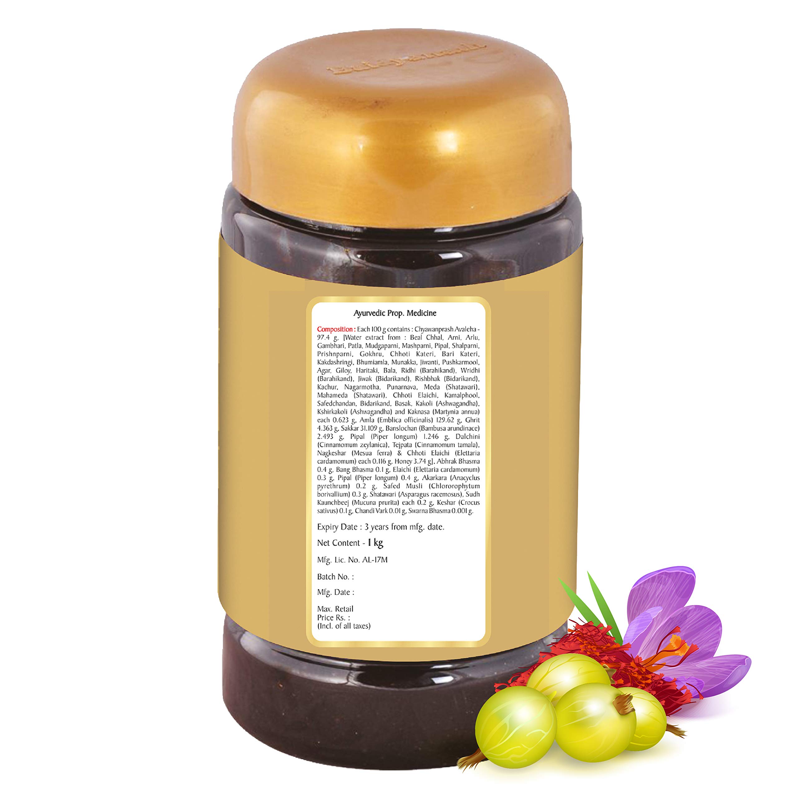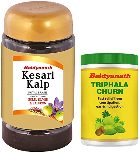 Baidyanath Kesari Kalp Royal Chyawanprash - 1kg - Promotes Vitality Strength & Stamina in Adults and Elderly | Revitalizer Enriched with Gold and SaffronBaidyanath Kesari Kalp Royal Chyawanprash is enriched with Gold Silver & Saffron with 44 herbs and minerals that help boost energy and vitality. Baidyanath Kesari Kalp Royal Chyawanprash is a unique research formula and is an Ayurvedic tonic that is formulated with the combination of rare herbs rich spices and fruits by renowned Ayurvedic scholars and Baidyanathâs Research Foundation. Made using responsibly sourced ingredients this product benefits and nourishes the body and helps maintain youthful energy and vigour.Baidyanath Triphala Churn - 500 g (Pack of 2)Triphala is a traditional Ayurvedic formulation made from 3 fruits - Amla Baheda and Haritaki. It is known as a herbal laxative that helps in quick relief from digestive distress like constipation acidity flatulence bloating and more. Baidyanath Triphala Churna uses the purest forms of Amla Baheda and Haritaki in this pack of Baidyanath Triphala Churna for complete digestive care. Mix 6-12 gm of Baidyanath Triphala Churna in a glass of hot water and consume daily on an empty stomach in the morning for best results.