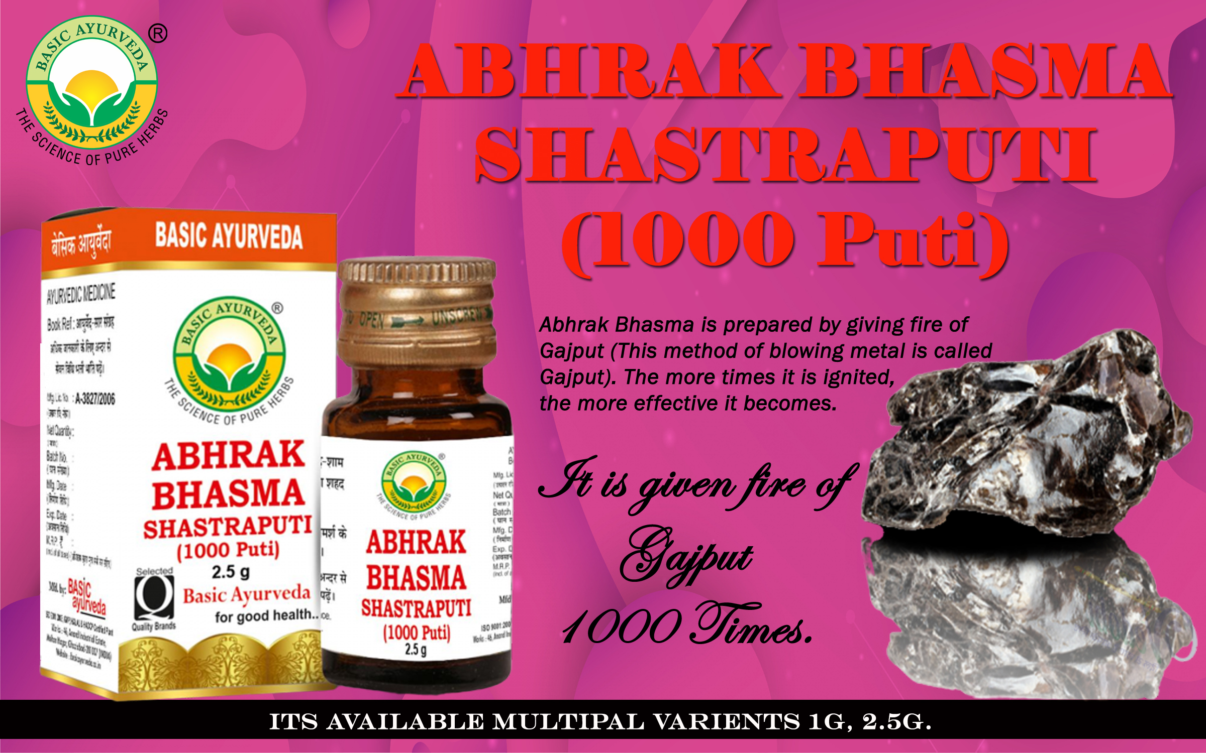 • Abhrak Bhasma Shastraputi is usually prepared via the calcination process which is termed as ‘Puta’ in Ayurveda. The number of putas or calcination processes defines the quality and therapeutic efficacy of abhrak bhasma.