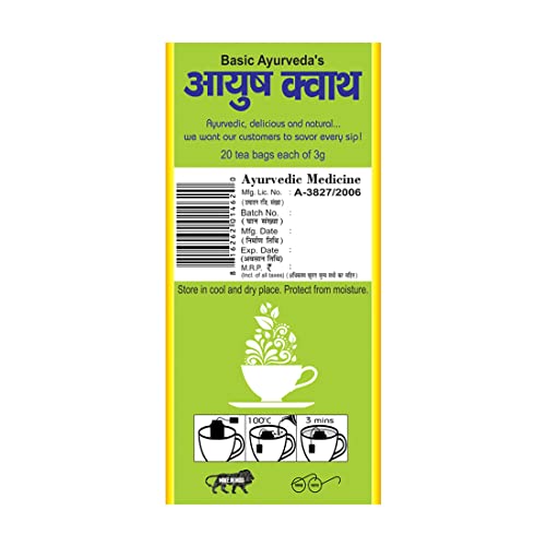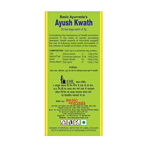 • Basic Ayurveda Ayush Kwath Infusion/Tea Bags is made up of ingredients that have a soothing effect on the throat and help protect the respiratory system from getting contaminated.