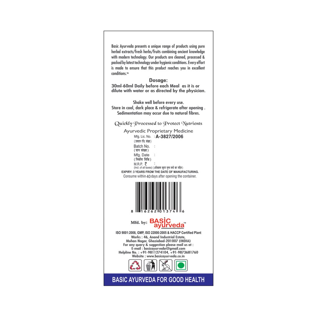 • This product is appreciated for its hygienic formulation long shelf life airtight packing purity and high effectiveness. Dosage: 15-30 mL. daily before each meal as it is or dilutes with water.