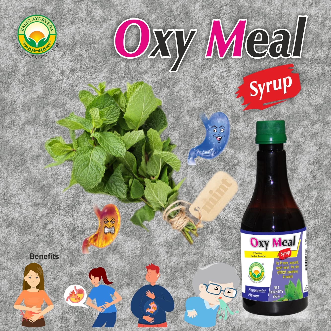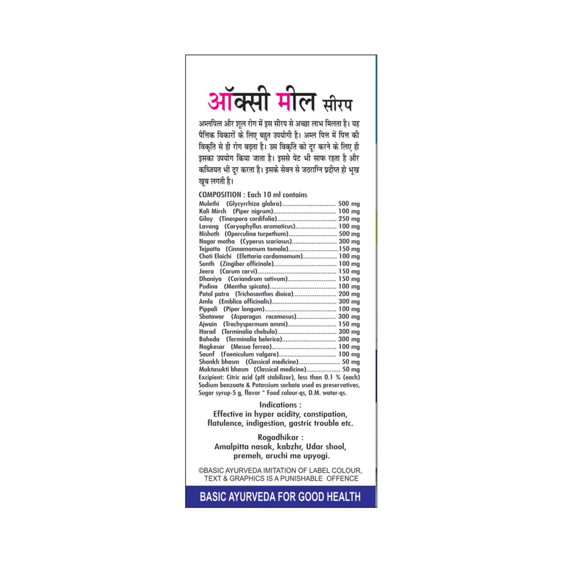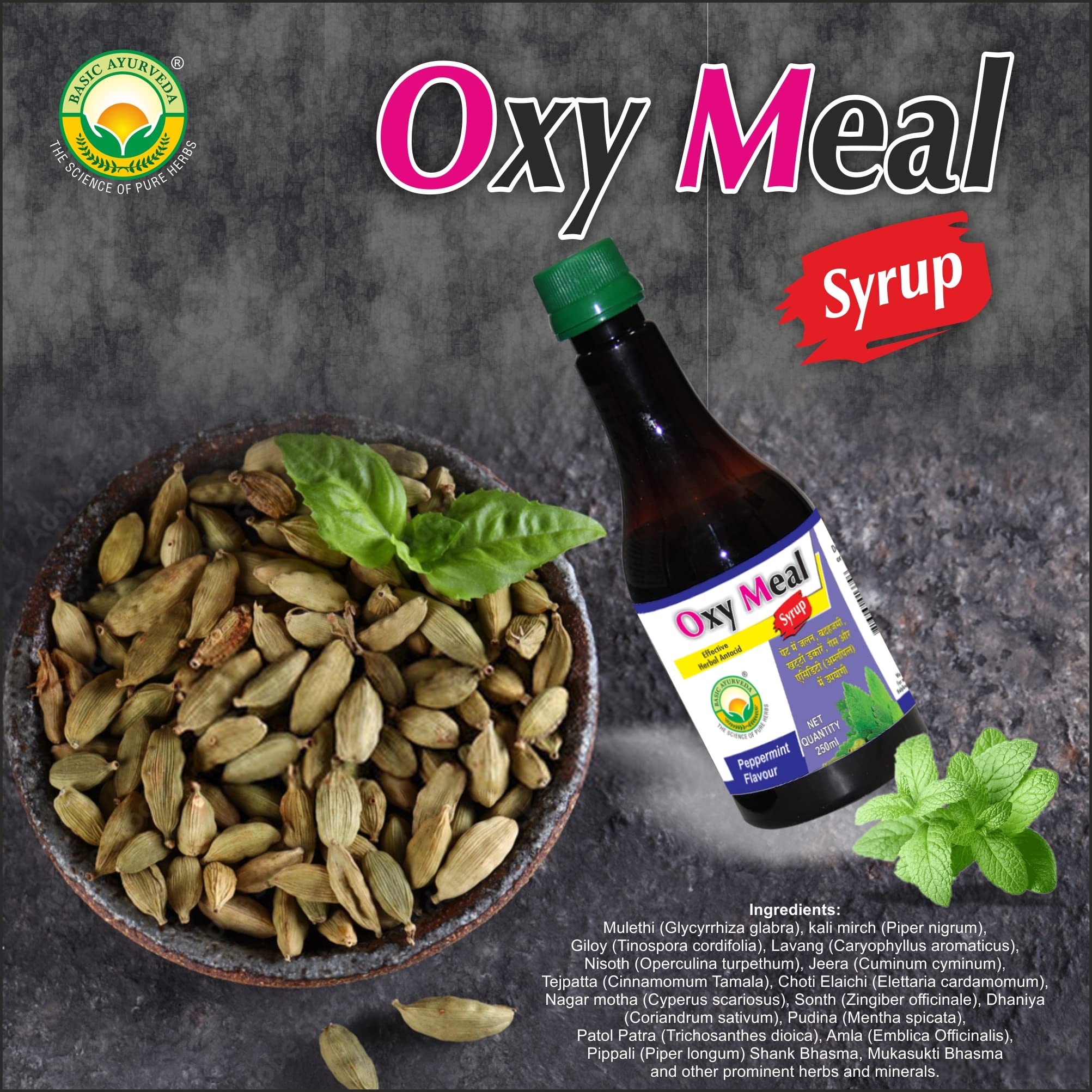 • Basic Ayurveda's Oxy meal syrup health Benefits: Ayurvedic Herb All type of stomach problems Effective in hyperacidity Benefits in heartburn Helps in ulcer Helpful in vomiting Effective in constipation Useful in gastric problem Effective in flatulence.