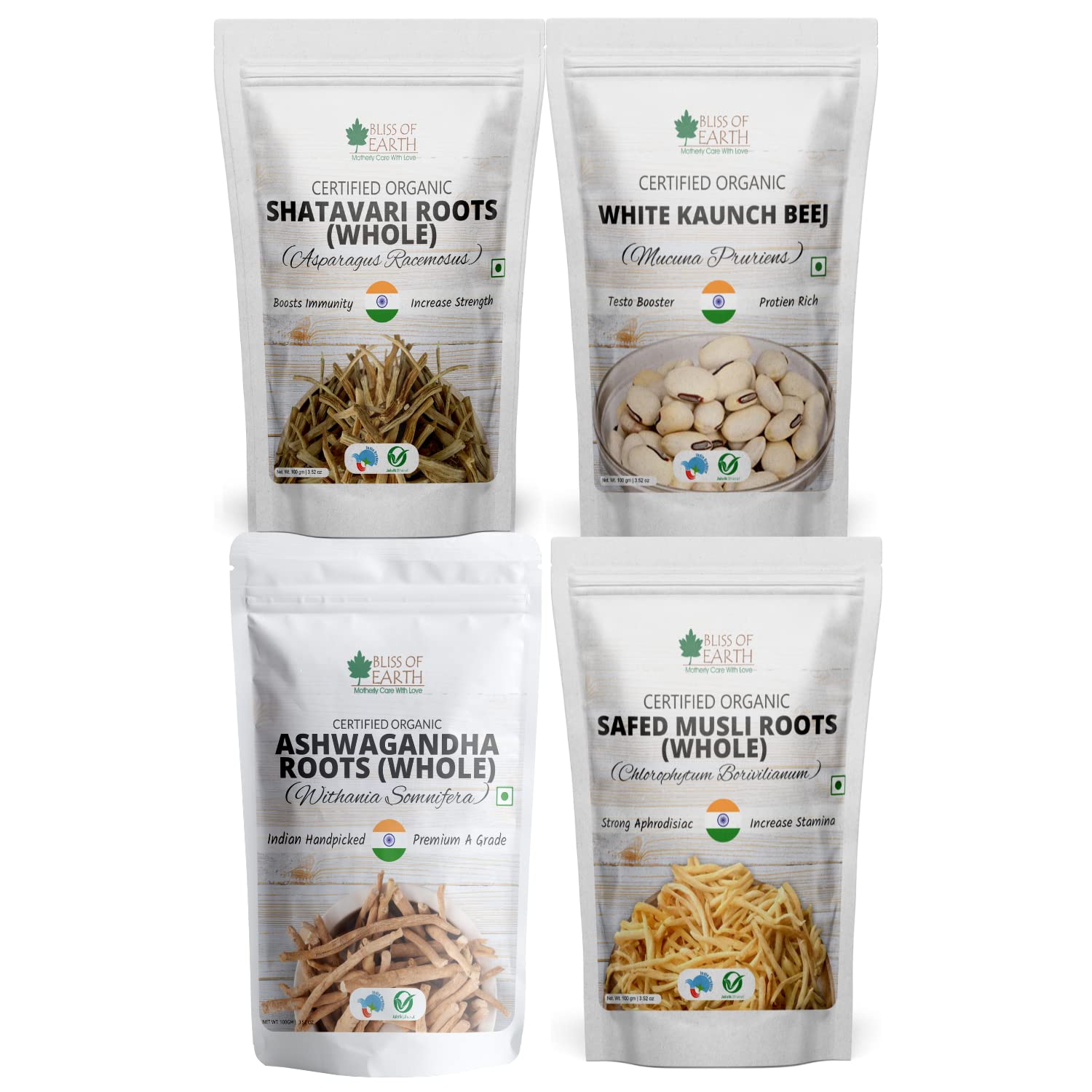 Bliss of Earth Ashwagandha Roots Kaunch Beej Shatavari Roots Safed Musli Roots Certified Organic Combo Good for Health & Wellness 100gm Each